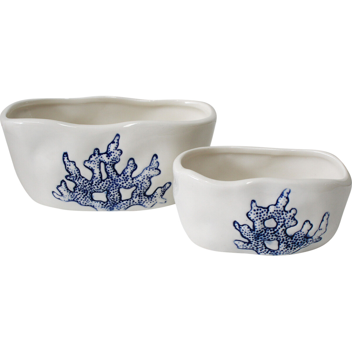 Showcasing a seamless blend of the colour white and blue, the Planter Oval S/2 Coral is a set of planters that would especially appeal to your customers who might be having various decorative and plant growing needs. It consists of two planters though having the same design, but moulded in different a different size. It consists of a larger sized planter which measures 17 centimetres in length and is 10 centimetres wid. The smaller planter on the other hand is 12 centimetres long and 8.5 centimetres wide.