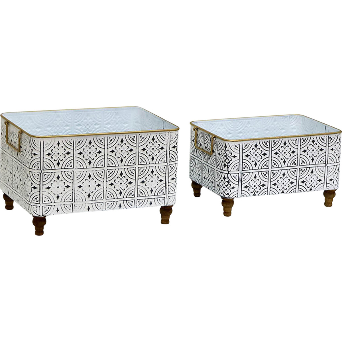 The Planter Rectangle White S/2 is an outstanding planter with an outstanding design. It a handmade planter crafted in an uncommon shape and with uncommon material combination. The rectangular shaped planter is made of premium quality metal while its four sturdy stands are made of 100% natural timber and provides firm, ergonomic support. The stands are smoothened and finished in it's natural brown colour while the planter is lacquered luxuriously in matte white with black painted shapely patterns. Completing the aesthetic look and practical functionality are two user-friendly handles; one on either end of the planter with both handles painted in gold colour just like the planter's rim.