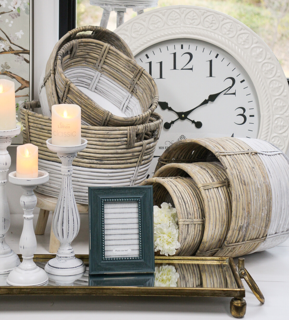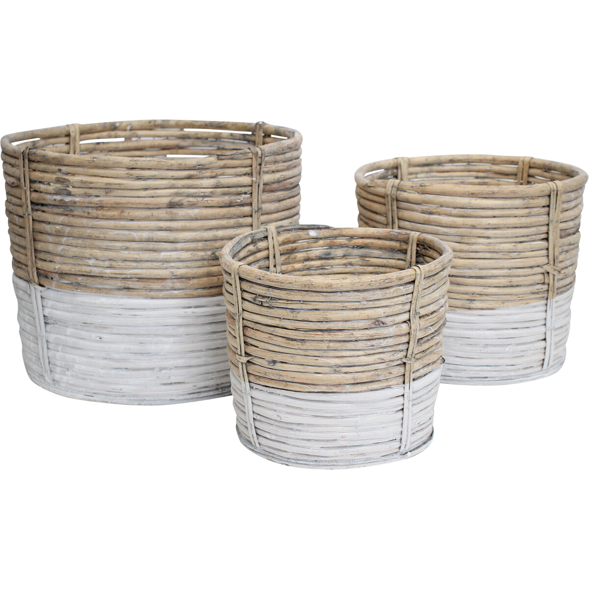 Each of the three baskets/planters contained in this set is hand crafted in a spacious design which is why it is multifunctional. The small sized version is handcrafted in a dimension which measures 23 centimetres in length, 23 centimetres in width and 21 centimetres in height. The medium sized version is made in a dimension which measures 28 centimetres in length, 28 centimetres in width and 25 centimetres in height. The largest of all three planters/baskets is made in a dimension which measures 35 centimetres in length, 35 centimetres in width and 29 centimetres in height. Each basket/planter has its base painted in white.
