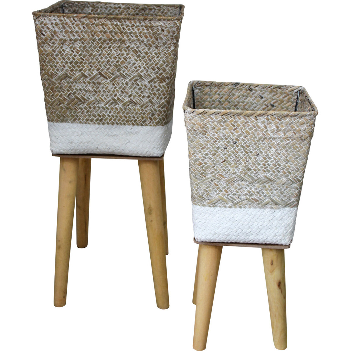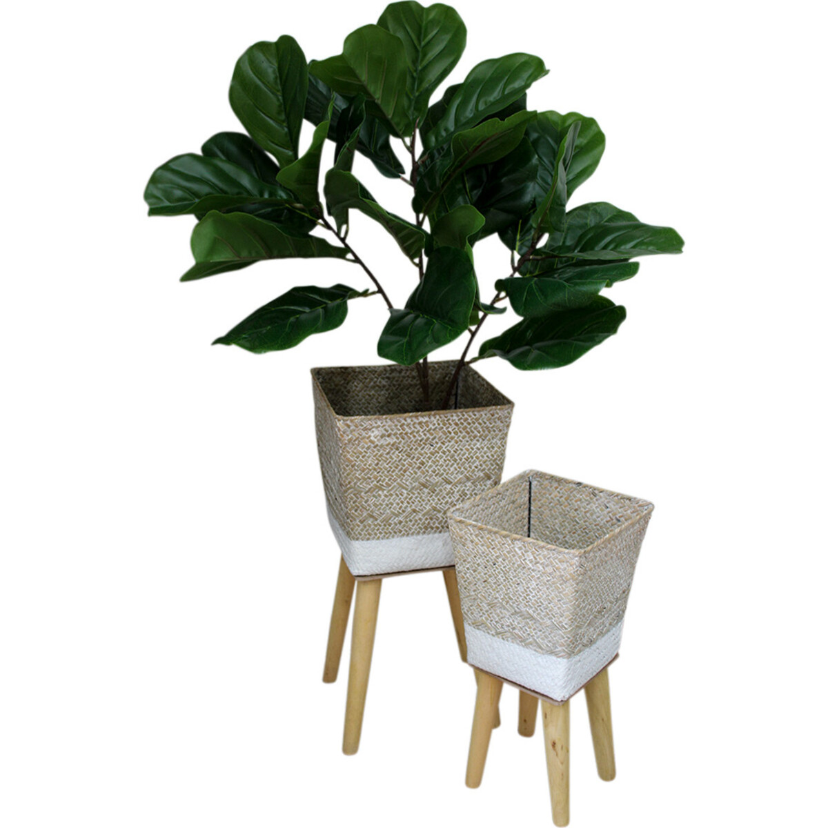 Give your spaces the advantage of plants that can be displayed in a spectacular manner helping you keep them as per height or size in a layered form. Here is a set that has two in different sizes - made from wood and straw. The classic pattern in an angular shape given to the straw made woven tub is perfect means to help enhance the beauty of your plants - be it leafy foliar or flowering ones, you could bring their beauty indoors and help make a vibrant impact on your interiors. The stunning beauty of the hand - woven tub does not take away from the fact that they are quite sturdy and placed atop tiny four - legged tables that will keep its balance despite the height of the plant. The metal made frame that gives the sturdiness to the structure adds to its stability. The white coloured band at the base gives it a dual tone adding much to its appeal.