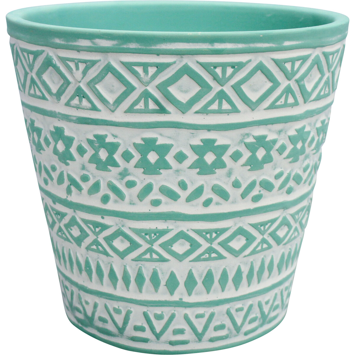 That tribal-inspired mint design feels fresh without being too out-there, so we see it working just as well in earthy boho homes as in something sleeker and more contemporary. It’s a great way to bring some colour into those minimalist interiors too. And with that bit of texture on the exterior - there’s definitely more depth than your average plain pot. Even empty, it still looks like decor! But with greenery, it really shines - snake plants or trailing pothos are a favourite pairing.