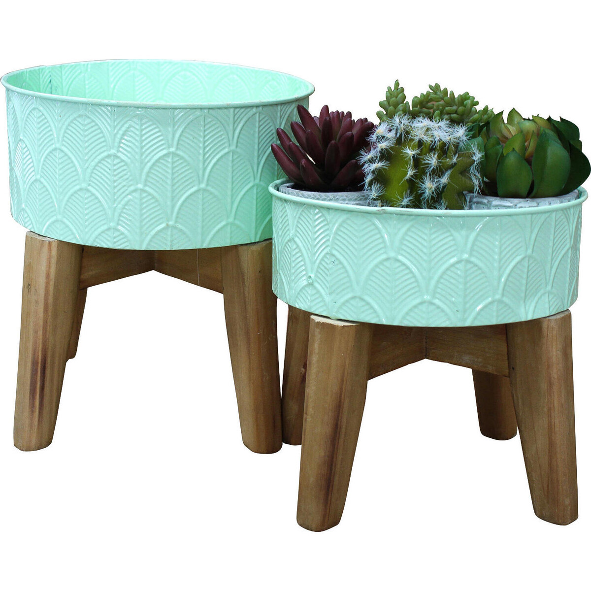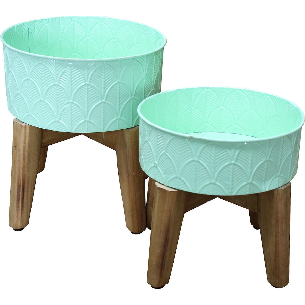 Bring to any space the beauty of plants with these planter tubs to assist your idea. Afterall, a great means to build in a soft and natural feel in any space is possible with plants yet we need just the right kind of planters to help us achieve that. Made from sturdy wood that make sup its base, and the metal tub that is in mint green and embossed with a gorgeous leaf pint-you could place a small plant and a slightly taller one as both sizes have been provided in the set. The pleasing colour in mint adds more to its appeal. You could use it for succulents that could be in smaller pots that could eb assembled inside the larger pot or use it for foliar and palms, they will help make any spot liven up with their presence. The gorgeous combination of timber and metal makes for an interesting sight. Helps bring in plants where you feel like adding some more attractiveness.