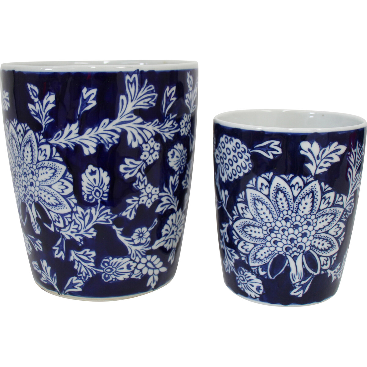 Moulded in a cylindrical shape, the interior of this Planter Vintage S/2 is a pristine glossy whiteness while the exterior is an alluring combination of navy blue and white palette. Hand-painted on the exterior of this set of two planters are lovely floral patterns rendered in white colour. These white floral patterns are glazed over a luxuriously painted navy blue background which is why the floral motif possesses such alluring beauty too bold not to be noticed by your customers. Plus, it is sold as a set which comprises of two different sizes which would fit in with every planting and decorative need.