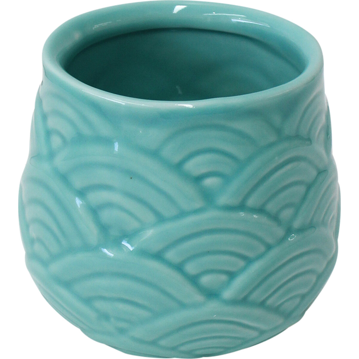 The Planter XS Waves Seafoam is a decorative staple as well as a highly functional plant growing medium. It is made in a vertically inclined cylindrical shape in a dimension which measures 9 centimetres in length, an equal 9 centimetres in width and standing at exactly 8 centimetres in height. The interior is shiny and smooth to the touch, but the exterior is designed with patterns inspired by sea waves.