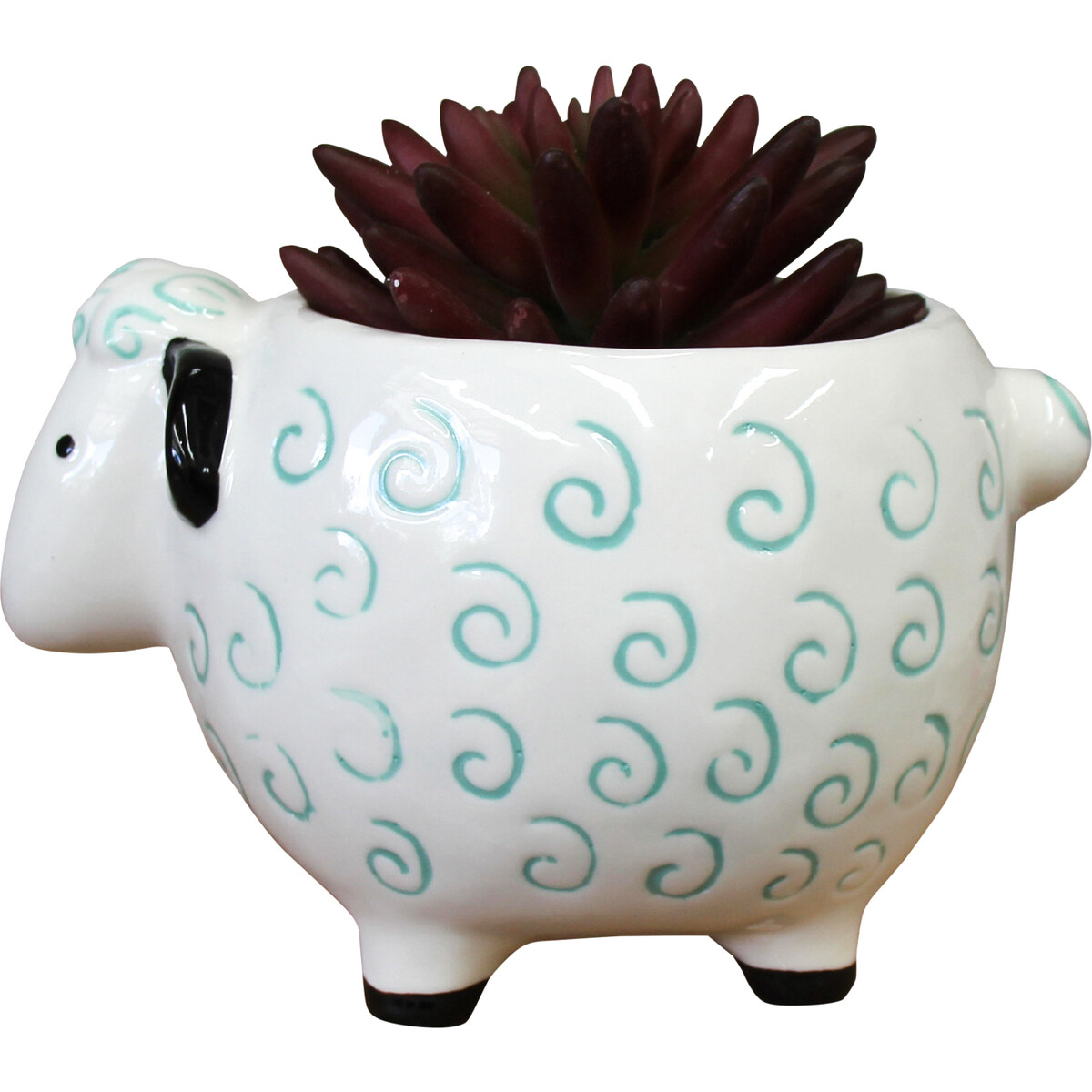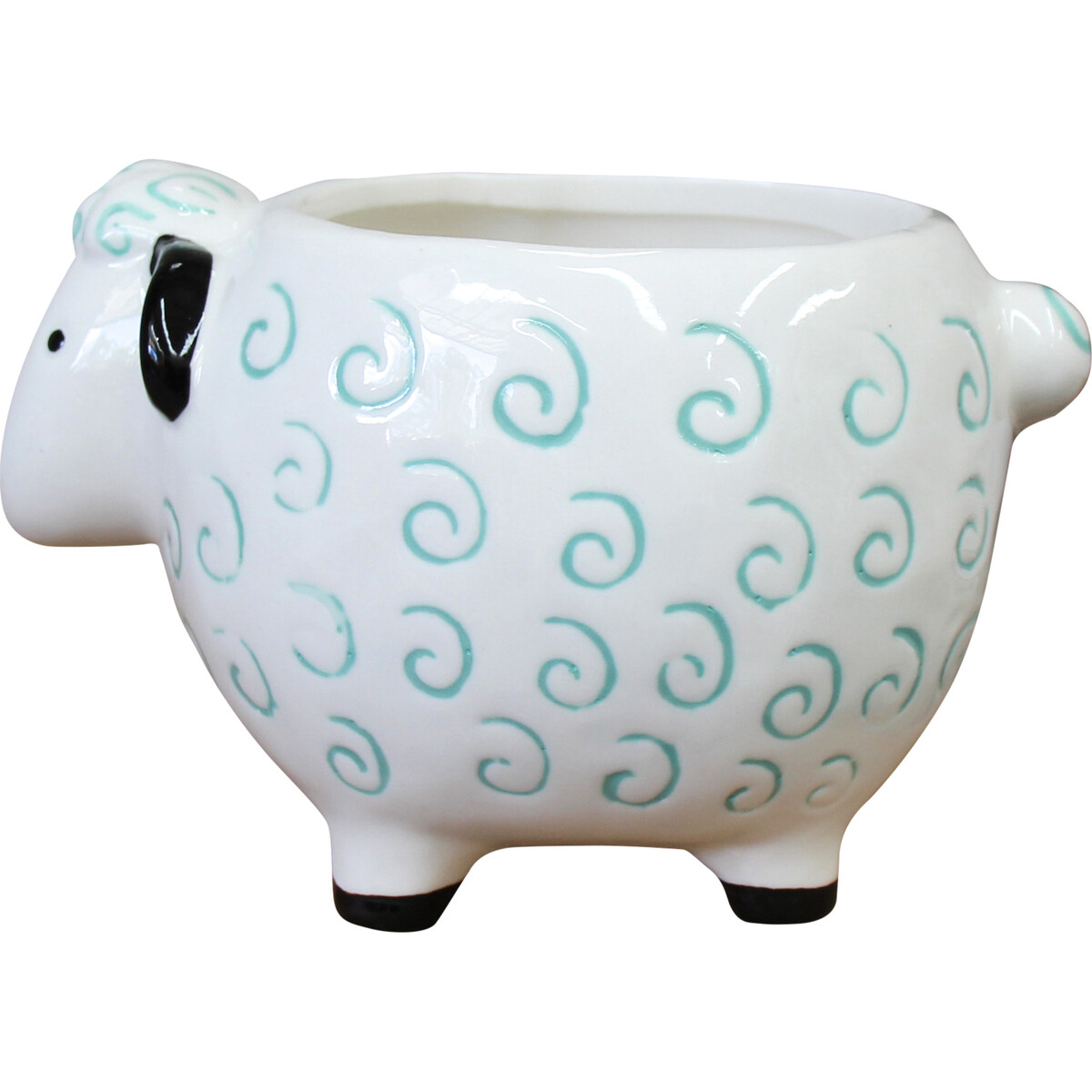 The Planter White Sheep is a decorative piece on its own even without the addition of flowers or plants. This is achieved through its deliberate choice of ceramic material which is intricately designed in the form of a sheep. It achieves its visual appeal through its paying of attention to even the smallest of details. The design features the head of a sheep, the black-painted ears, black dotted eyes, a short tail and four stout, sturdy legs the underneath of which is painted black. There glazed body is painted in a glossy white colour with jade-green coloured patterns. This design makes it a peculiar planter that would add a great deal to the visual outlook of any building's indoor or outdoor. There are 16 pieces in every carton and plants are not included.