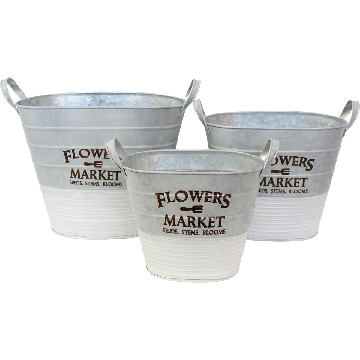 The planters oval host and industrial print on the front and the white lower body helps make it look all the ore shabby chic. The handle son the sides help in carrying and placing them with ease. The sizes vary thus allowing you to use them for the small bushy plants to the taller variety be it a flowering one or a foliar. Will help create that green corner you always wanted. The advent of the vintage chic and farm and country style d?©cor. Help build in a more relaxed and breathable feel in your settings- be it in your patio or even if you wish to take the to your balcony. Will hold any kind of clay r plastic pot with your green nestling in them.