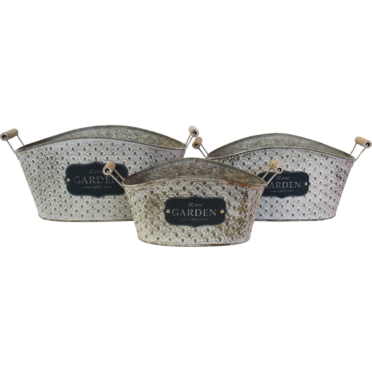 Our vintage-inspired Planters Oval S/3 are a favourite for homeware and plant lovers alike. This set of three nestable planters in graduated sizes brings a charming bit of nostalgia to any shop, with their antique lace-look pattern and rustic white finish. The distressed metal gives them that modern farmhouse vibe while still nodding to classic Victorian style. The decorative 'Rose Garden 1892' tag is a sweet touch. We think they make brilliant catchalls for keys and mail near the door, organisers for bath goods or beauty products, or beautiful centrepieces with faux florals. And we love the idea of customers picking them up as housewarming gifts - you can never have too many cute containers for bits and bobs. Their dimensions suit all sorts of homes: large at 32x21x17.5cm, medium 28x17.5x15cm, and small at 24x14.5x13.5cm. Altogether a useful set that helps create those homely vignettes people can’t get enough of!