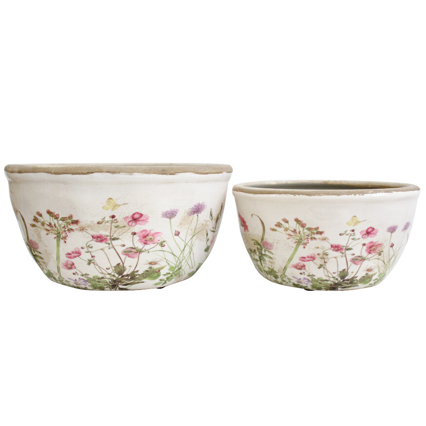 We have a bit of a soft spot for these Planters S/2 Low Botanical - there’s just something about the sweet, vintage-wildflower art that feels incredibly fresh and inviting. The first thing we noticed is the unique, rustic quality of each piece. They’re handcrafted and finished in ceramic, and every single one has its own little quirks - no two will be exactly alike. That kind of character really comes through in person, and in our experience it’s what makes people reach out and touch them on display.