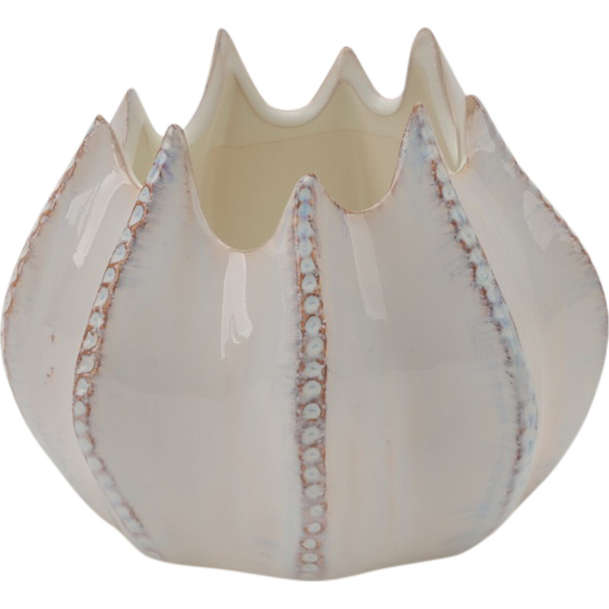 The ceramic pod has this unique off white to ivory colour that adds to the sheer opaqueness of the body-you can almost see and yet not quite-what tender secret it holds within, the petal like shapes adds the facets to its body. The bowl like shape of this 13 cm tall vase has a wavering top-wave like shape ending the petal like facet that rises up in a soft curving shape. The delightful mix of a modern idea with an age-old traditional ceramic, makes this quite a unique kind of accent for any mantle or table top. Each facet ends in a thin line that demarcates one petal from the other. The vase or bowl, sist well balanced on a round base. Adding such fine quality ceramic adds to the elegance- and an old-world charm to the look of any space.