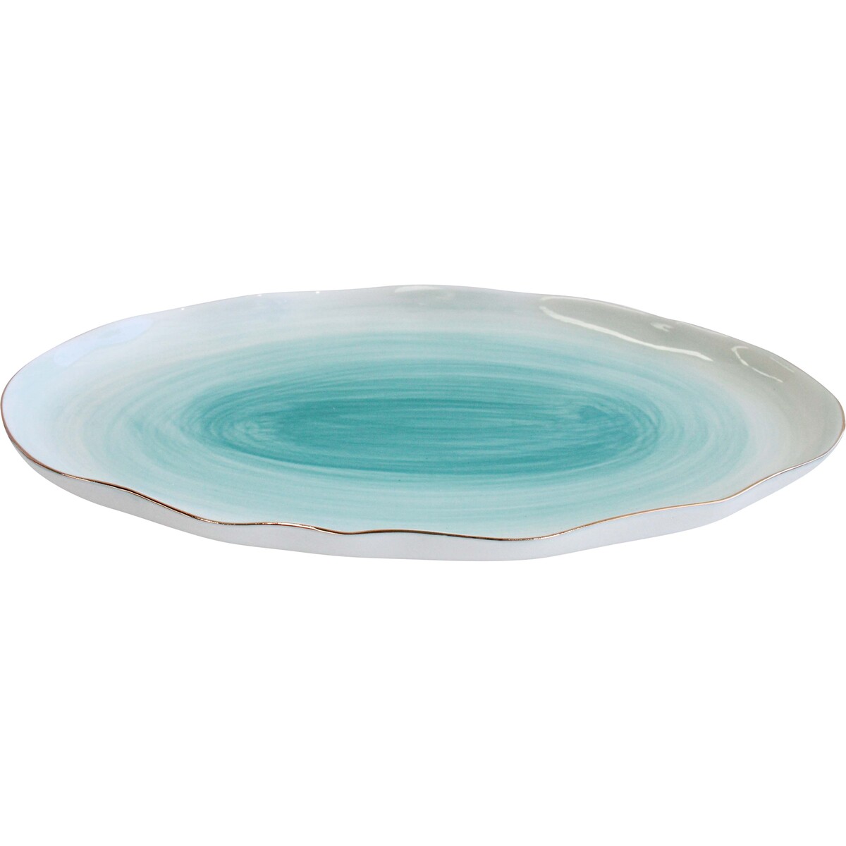 Our Plate Artisan Ocean has this fresh, inviting energy that just works. It’s 29.5x17.5x2cm and the shade is this calming, soft blue - a total standout but still easy enough to slot into so many home or office décor styles. Coastal, modern, summer party - we’ve seen it fit right in as a feature piece or even just casually dotted around as an accent. And the hand-finished ceramic means no two are exactly alike. There’s something about the way the metallic gold paint on those wavy edges catches the light - just adds that extra bit of effortlessness to any table. We like being able to offer things that are unique but don’t feel try-hard or too seasonal, you know? Quick note for your customers - these plates do need a little more care than usual because of those beautiful hand-finished gold edges (so handwash only) and they’re not meant for microwave use either!