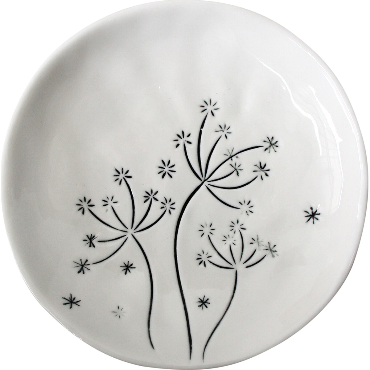 Deliberately made in a wide dimension, the Plate Dandelions is practically functional in serving quite a good number of dishes. It is made in a wide, perfectly round dimension which measures 15.5 centimetres in its width and 15.5 centimetres in length. The plate is glazed in an elegant white colour but drawing inspiration from the beautiful dandelions. It is on this white glossy surface that three portraits of dandelion plants are ornately rendered in jet black hue. Place your order now before we run out of stock as it is selling fast!