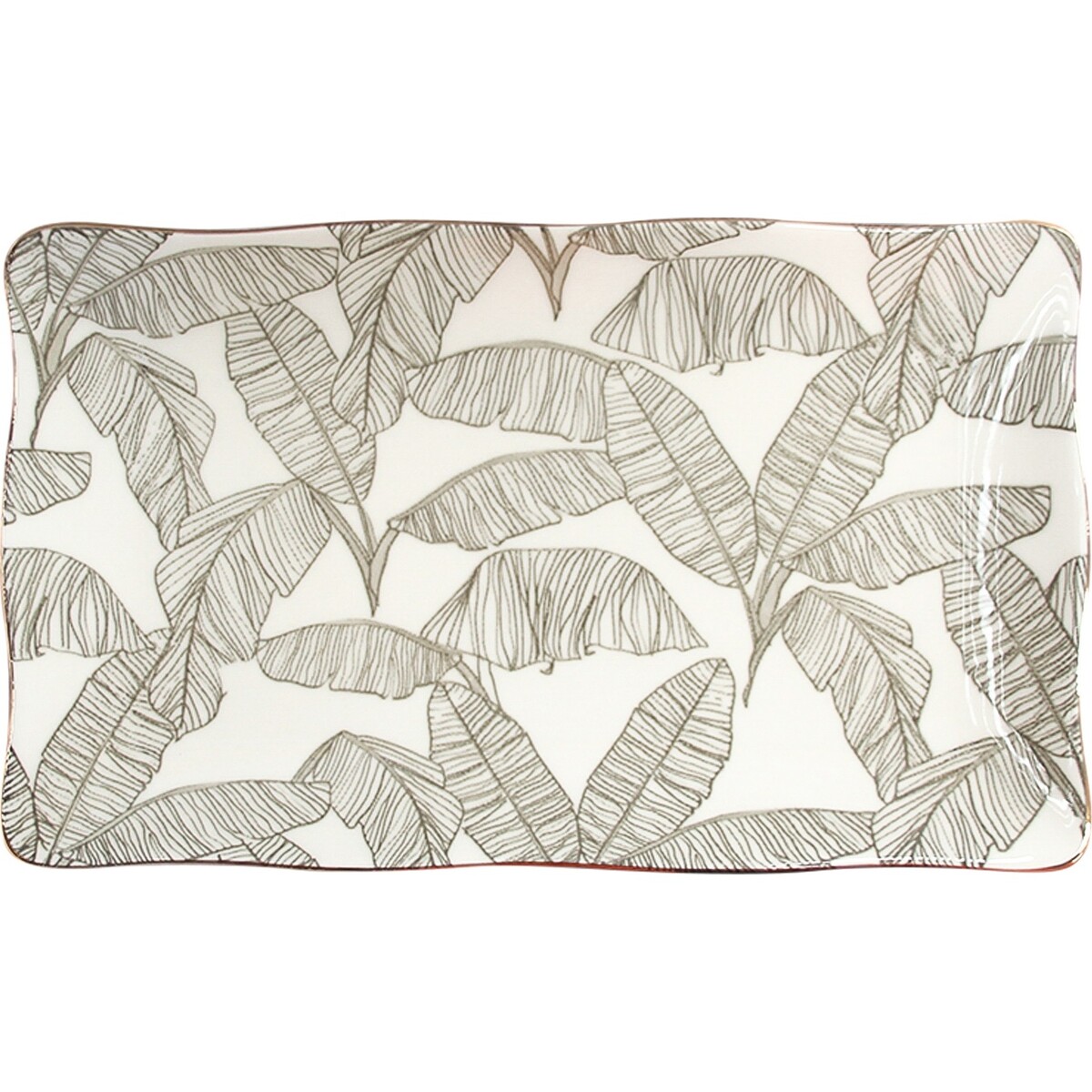 Layered leaves and sticking details characterize this design. It additionally adds impressive depth to this breakfast ware. Homeowners who adore luxurious items can opt for this serving tray. Plate Rect Banana Leaf has a high-end feel, a gold rim that accentuates its deluxe vibe. This porcelain piece is cosy. It affords for romantic gestures like breakfast in bed or only for late-night snacking. Use this rectangular flat surface to serve snacks and a glass of freshly squeezed juice to the guest. This classic essence even looks more beautiful on an ottoman. Chocolates can be served in this flat plate either for one's consumption or to enthral guests.