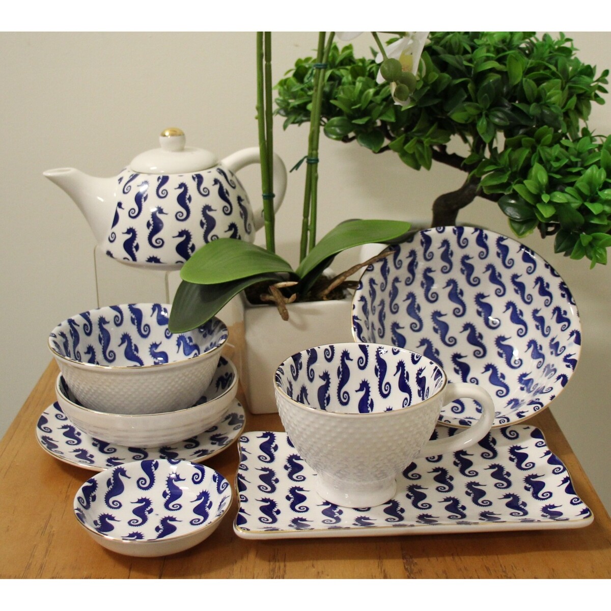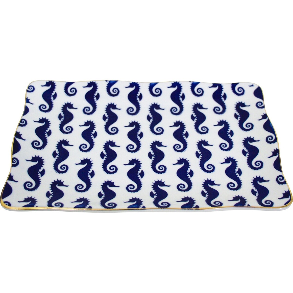 The tray is all of 20 cm in length while its width is 12 cm making it a large enough rectangular shaped platter like shape. The porcelain has been given a wonderful high glaze speaking much about the expertise with which it has been created, the blue coloured seahorse print adds a quirky feel -very marine and beachy in its look. Will make a plate perfect for serving cheese or cake slices or better still as a serving tray as well. While the top is covered in print, the underside of the tray is plain white. Gives a delightful boost of style to your setting when you add prints on serve ware that have a modern feel to it. Despite washing and usage, the blueness of the print will not fade. the tray has a slight depth of 2 cm and its edges are lined in gold, giving it a lovely smooth well-defined finish.