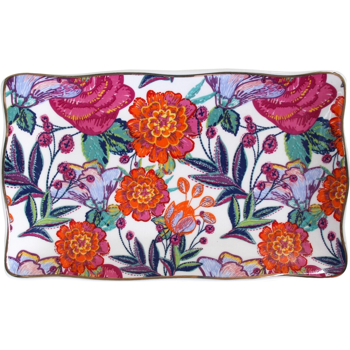 This visually appealing print has brilliant colours and an assortment of flowers radiating a calming aura. This hybrid of cultural beauty and functionality lionizes hand-painted design on canvas, weft-faced weaving, embroidery, needlepoint, cross-stitch of the elegant tapestry. Plate Rect Vintage Tapestry features slightly raised edges, flat containers and gold rim. Vibrant coloured utensils have a positive impression of making food appear appealing and appetizing. Do not just hand over a bowl to a guest. Compliment any liquid or substantial servings with this piece. This classic white porcelain rectangular plate is the perfect mother's day gift or a personalized hostess gift.