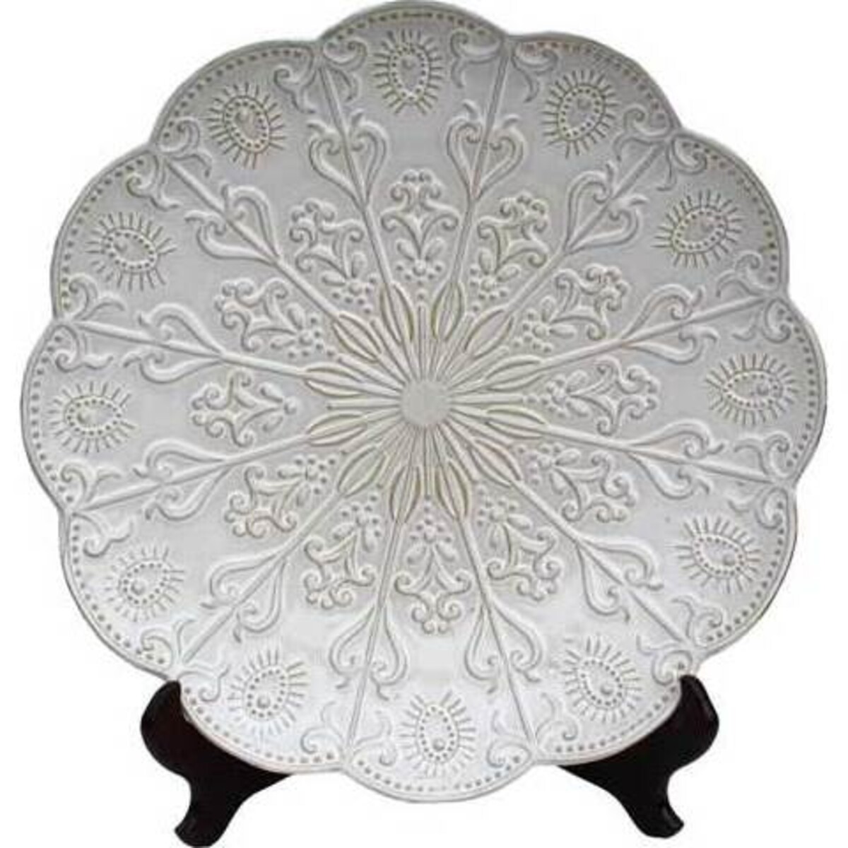 • White ceramic plate has a divided look that's achieved by the use of raised ornamentation