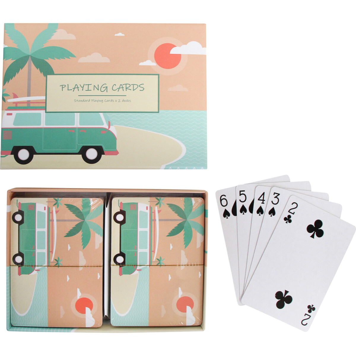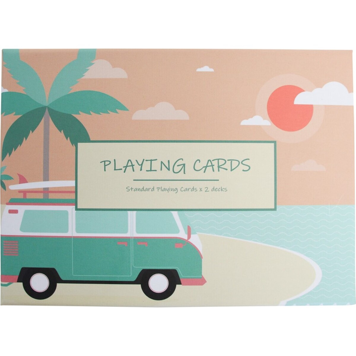 This standard playing cards in which each pack contains 52 cards and each box is sold as a pack of 2 decks, has an advantage over conventional cards due to its ornamental appeal, Combi/beach theme and increased number of playing cards for increased amount of fun! Beautifully drawn on the surface of the playing card box is a popular holiday bus - the Combi. The minibus is painted in a pretty palette of jungle green, white, black and French rose shade of pink. The bus is parked on the sandy beach close to the sea.
