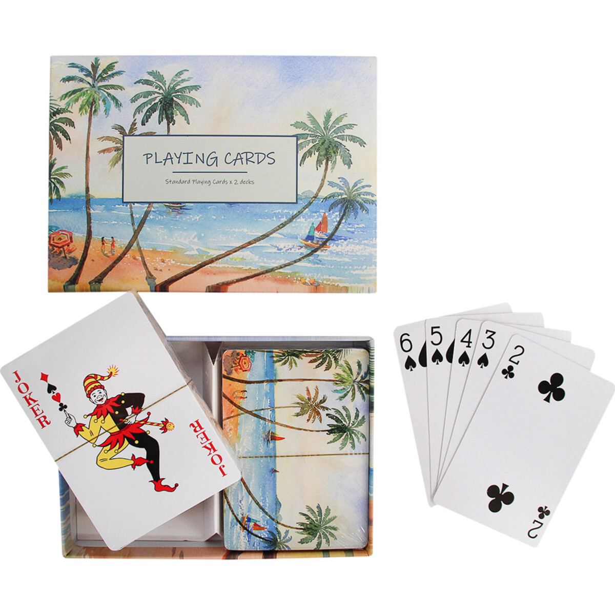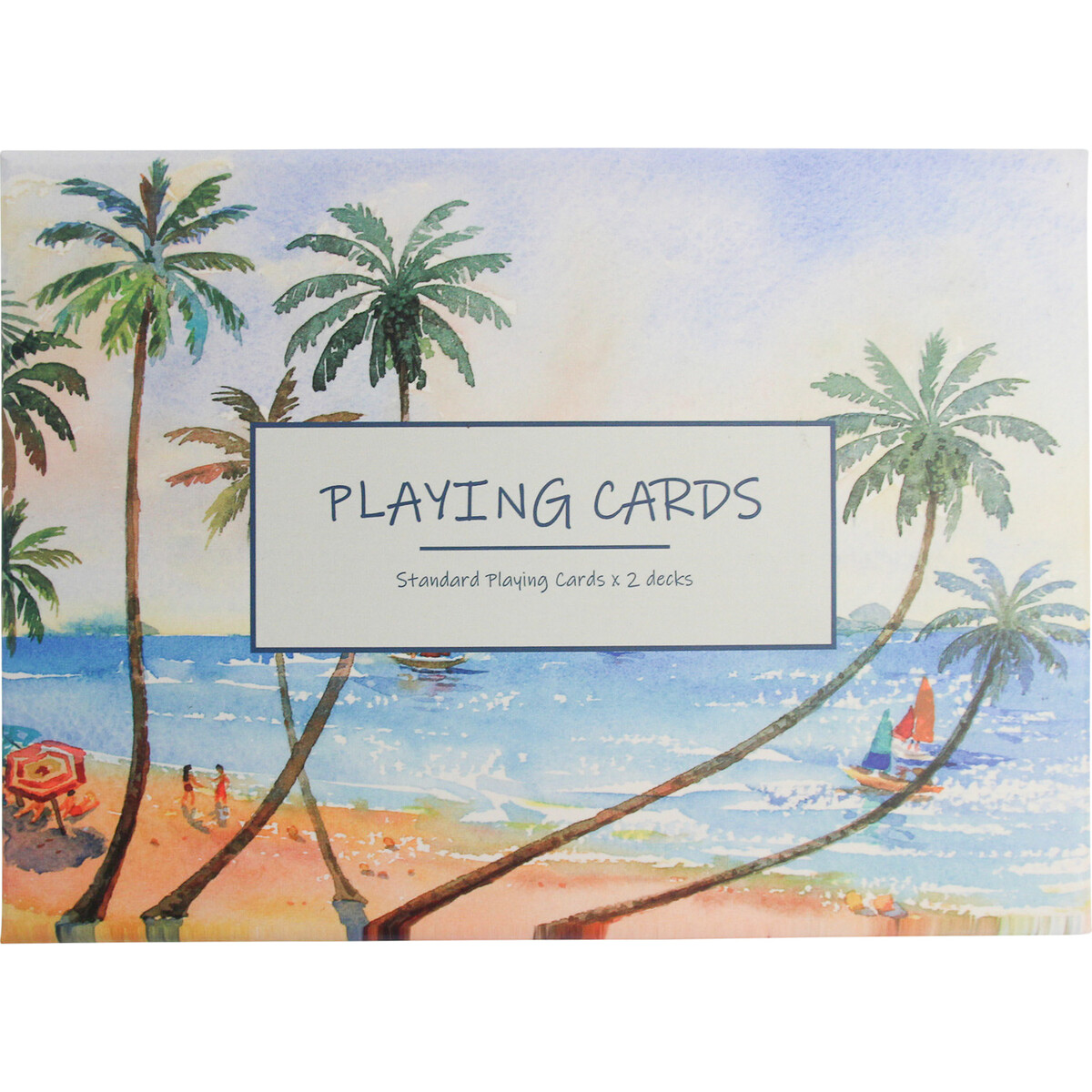 The Playing Cards Vacation has its body colourfully painted with the typical image of a vacation. Charmingly depicted is the scene of a beach. The scene showcases what is usually found at beaches which includes several palm trees (none of which are straight), sailboats on the sea, a sandy beach, a man and woman standing on the beach, while another naps underneath an erected temporary canopy. This depicted scene gives it a vacation/holiday/beach theme which makes it perfect for use whether on the beach, at home, in the school playing field, on a picnic in the park or garden, and anywhere else your customers wish to have some fun.