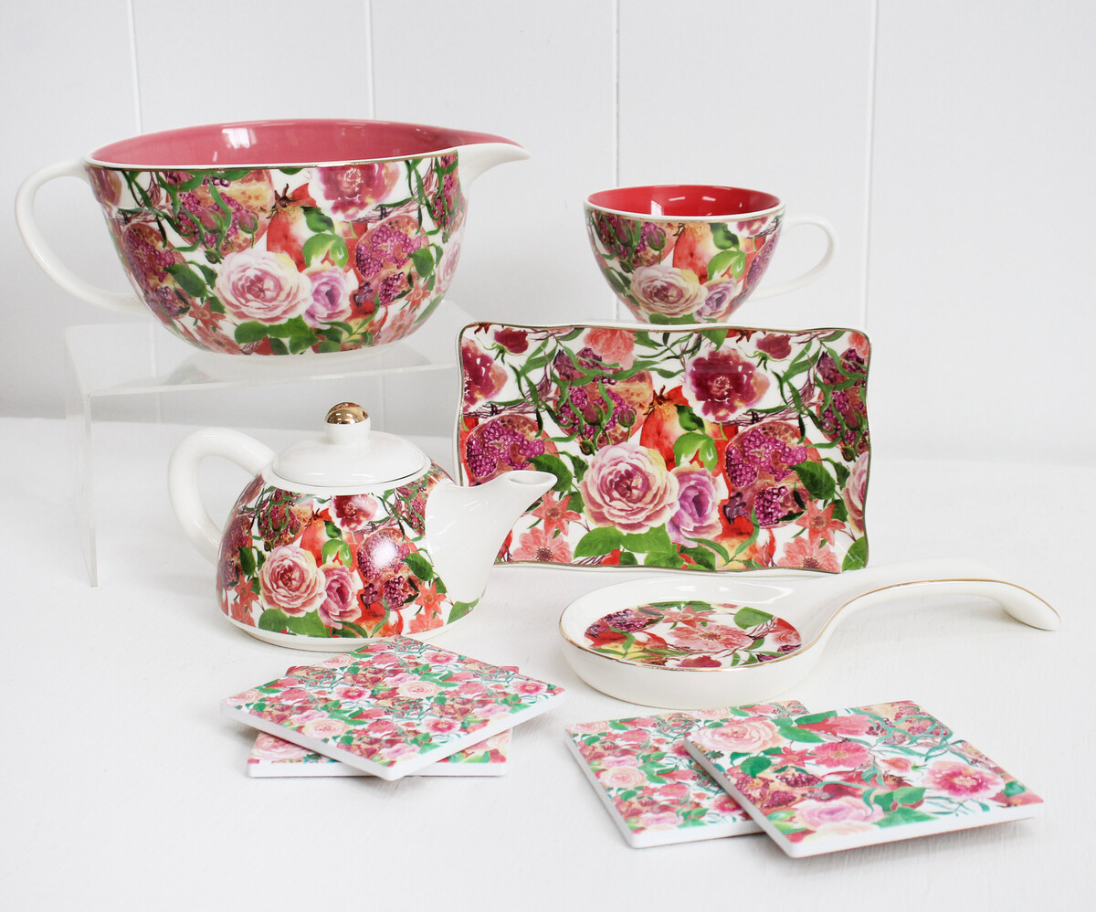 The Pomegranate Package consists of Kitchen & Table serving ware that showcases unconventional aesthetic finesse. The package contains frequently loved choices such as 2 pieces of mixing jugs, 6 pomegranates themed cups suitable for taking tea, 2 classically shaped teapots, 2 sets of differently sized four measuring cups, 6 flattened ceramic plates, 4 elegant serving spoons, and four sets of coasters with each coaster set consisting of 4 square shaped coasters. Each of these products is tastefully crafted using premium quality ceramic materials. Apart from the colourful exterior glazing, some of these products also have their interior glazed in bright colourful appeal.