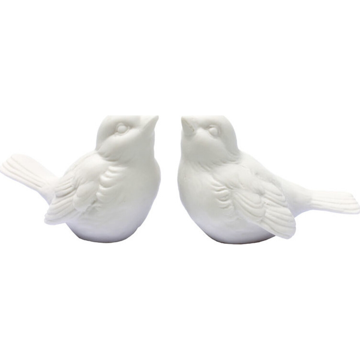 Let these two small porcelain birds into your life and into your home. Sparrows do not like to be alone, and it has been said that they mate for life. So it is always a good idea to buy them in sets of two. These darling figurines have been fashioned to resemble a white version of the garden sparrow. They are squat and compact. The neutral colour works well in a variety of environments and the fine detail are romantic in appearance. Two birds sometimes sit together but they are also able to fly apart. The small porcelain sparrows would look fun and quirky breaking up the background of the home or garden, on a bookshelf or window sill.