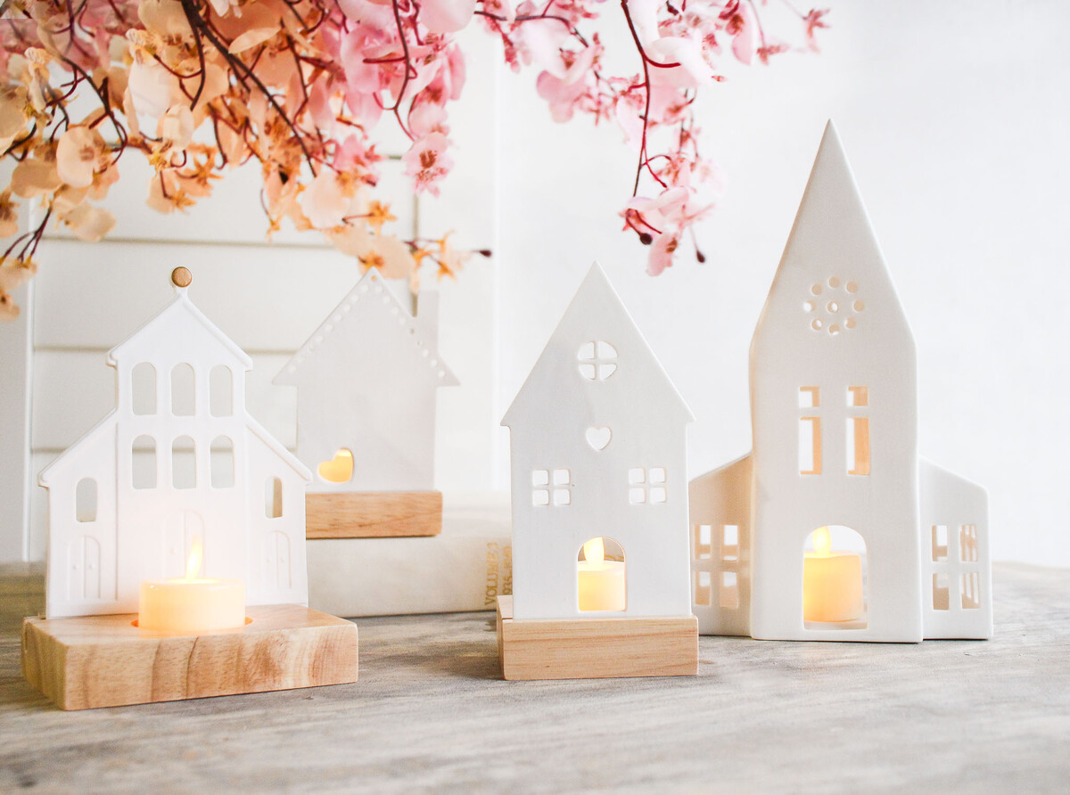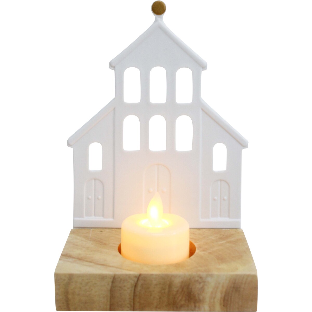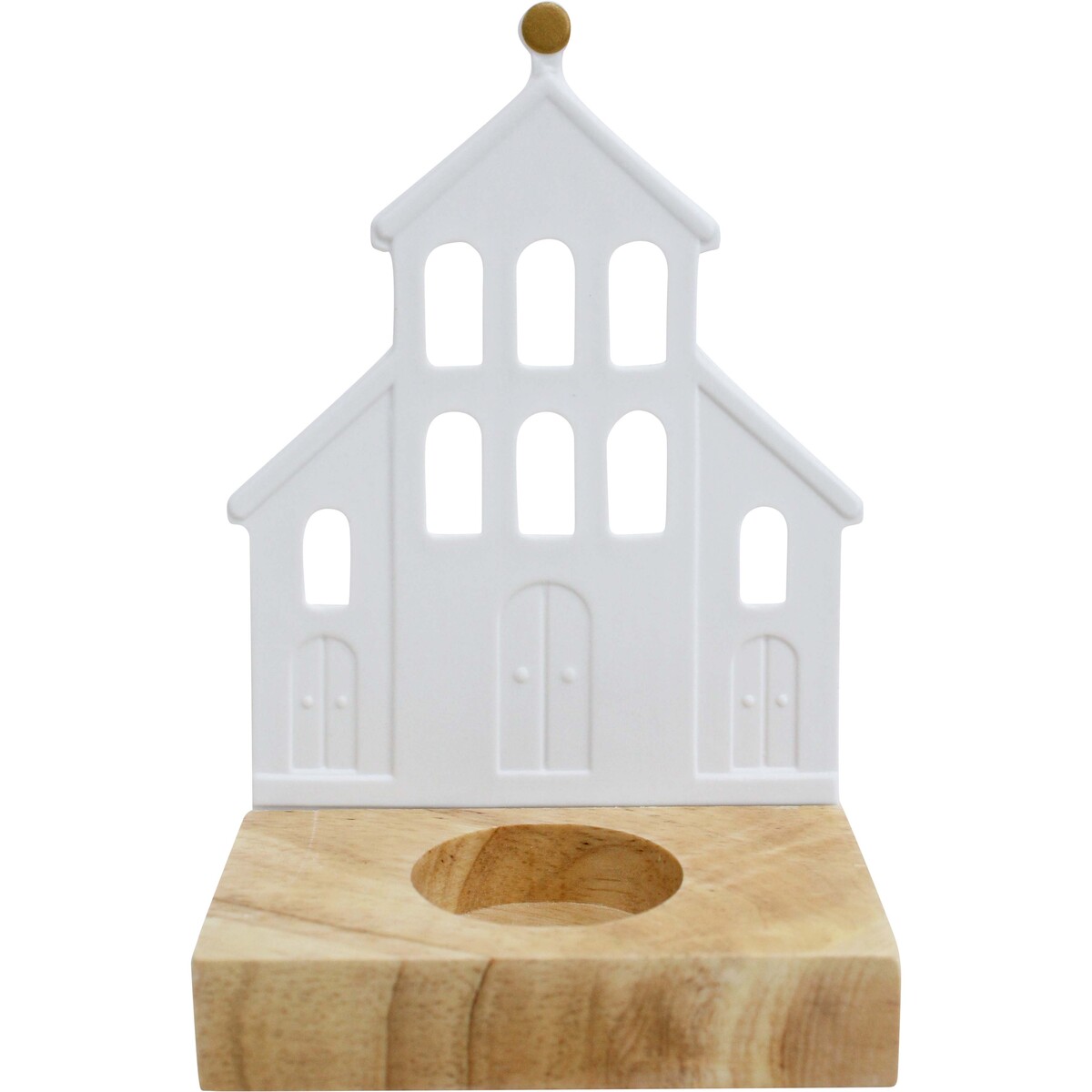 Our porcelain tealight holder is a welcome addition to any homewares collection, with its understated charm and unique church-inspired design. The tall silhouette and matte-white finish are accentuated by cut-out doorways, arched windows and warm honey-toned timber. Together these work to create an ethereal display when paired with a lit tealight or LED candle. Measuring 10 x 10.5 x 14 cm, this piece is compact enough to fit on most surfaces - shelves, coffee tables, and mantlepieces come to mind as great places to show off this vessel's beauty.
