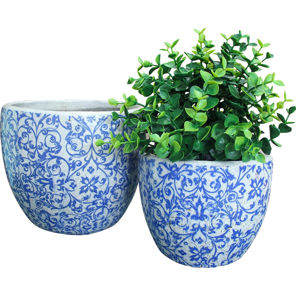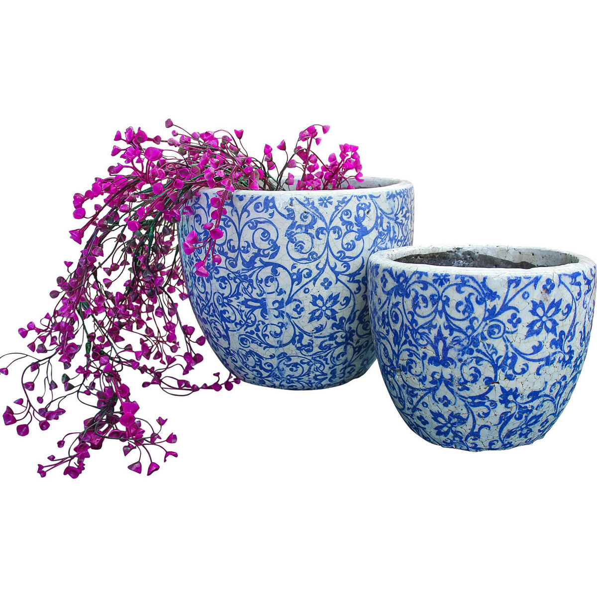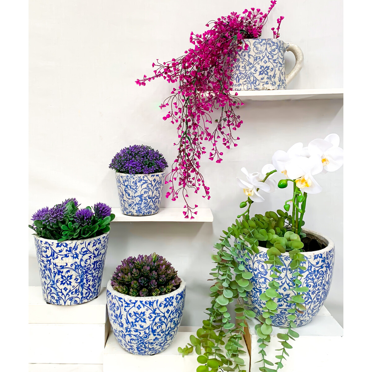 Bring a little nature into your home with this set featuring an eye-catching vine pattern in blue and an old world distressed split tile finish. An ideal choice for indoors, porches, patios, decks and more, this set can be used indoors or outdoors and will enhance any space along with giving more attention to your favourite plants.