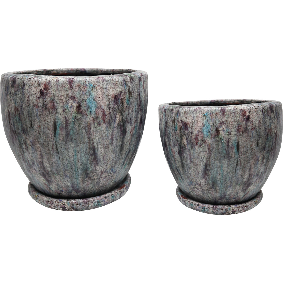 The Pot Curve S/2 Storm has a splash of dimmed colours and curved bowl shapeliness which gives it an irresistible worn out decorative appearance. Its splash of weathered worn out colours of purple, green, and possibly maroon red over an ash white background gives this functional planting pot an ancient feel of originality. It comes in a set of two different sizes which you could sell off as a set or sell individually for possible higher profits. This is the product that is sure to serve your clients for years without losing its touch of rustic uniqueness.