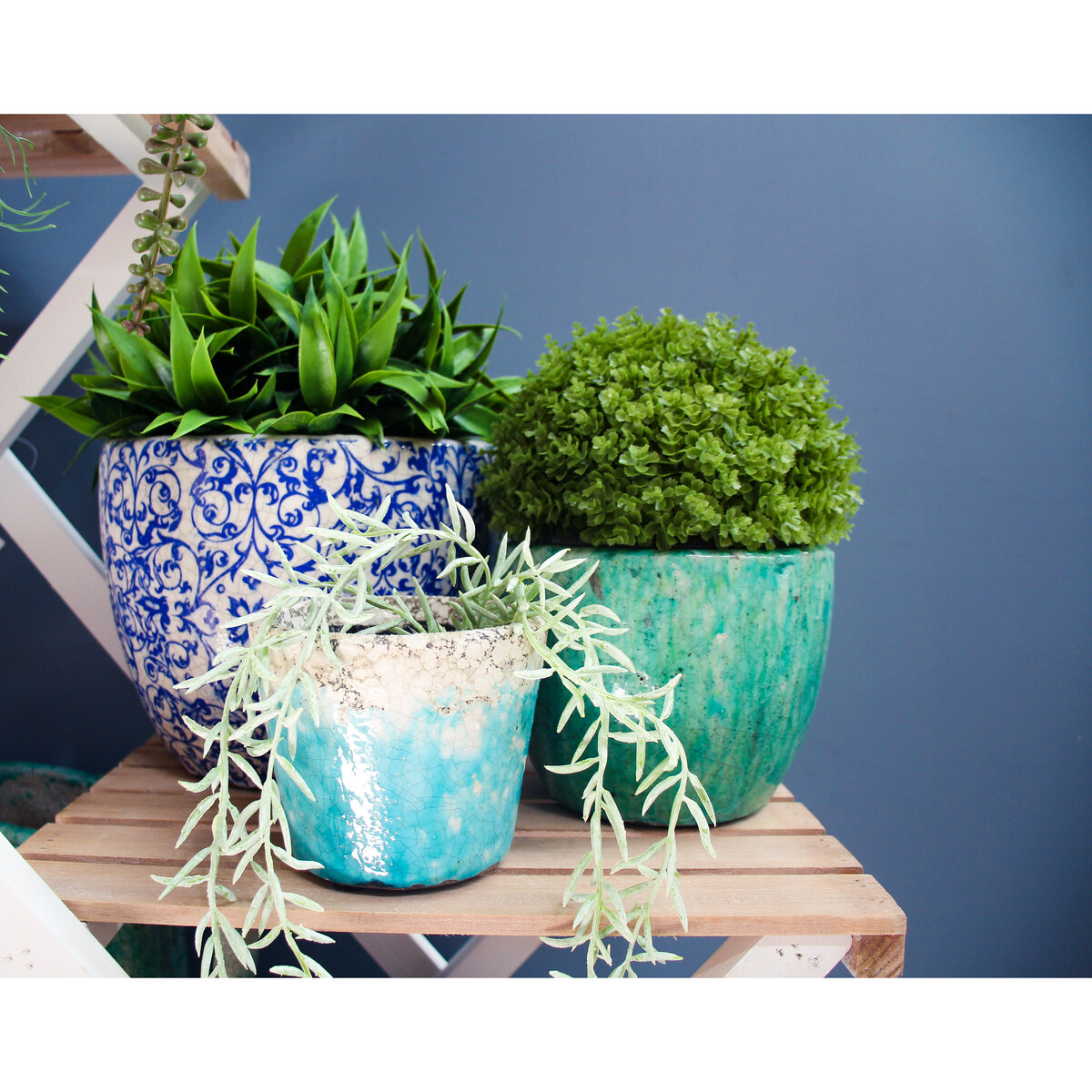 The white crackled finish on top resembles frosted snow, making these pots ideal as a decor item during the holiday season to display small to medium-sized, real or artificial Christmas trees or as a lovely centrepiece on the tabletops with colourful picks filled in! Handmade from ceramic, each piece is nice and heavy so this set won't topple over in the wind if you live right off the ocean where it is slightly windy and it is sure to catch people's attention who will love the colour, the depth and the design!