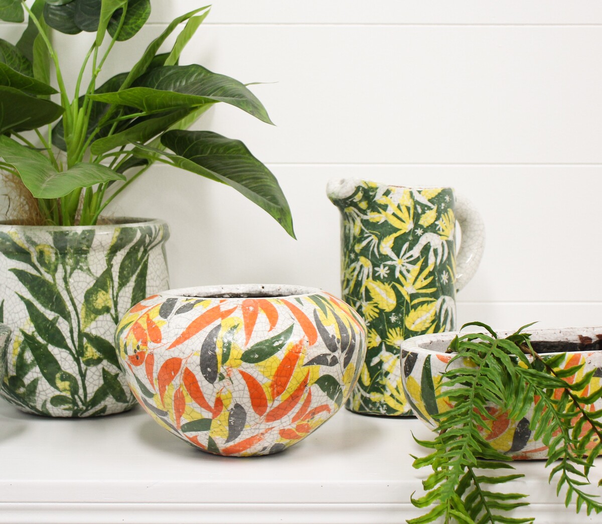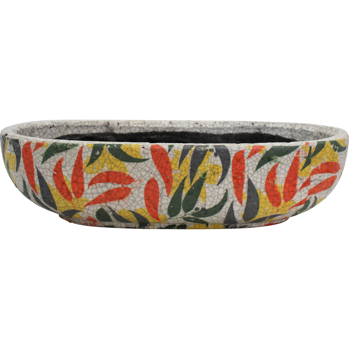 It is made in an oval shape which has a dimension measuring 37 centimetres in just length, 15 centimetres in its width and has a height which measures 10 centimetres. The interior of this oval planter is painted in black hue while the exterior, having an ash-white background, features colourful images of the familiar eucalyptus leaves. Given its somewhat horizontally inclined shape, this pot would be perfect for placement in strategic locations like windowsills where the colourful painting can catch some sunlight. There are three of these pots in every carton if you decided to buy today before stocks run out.