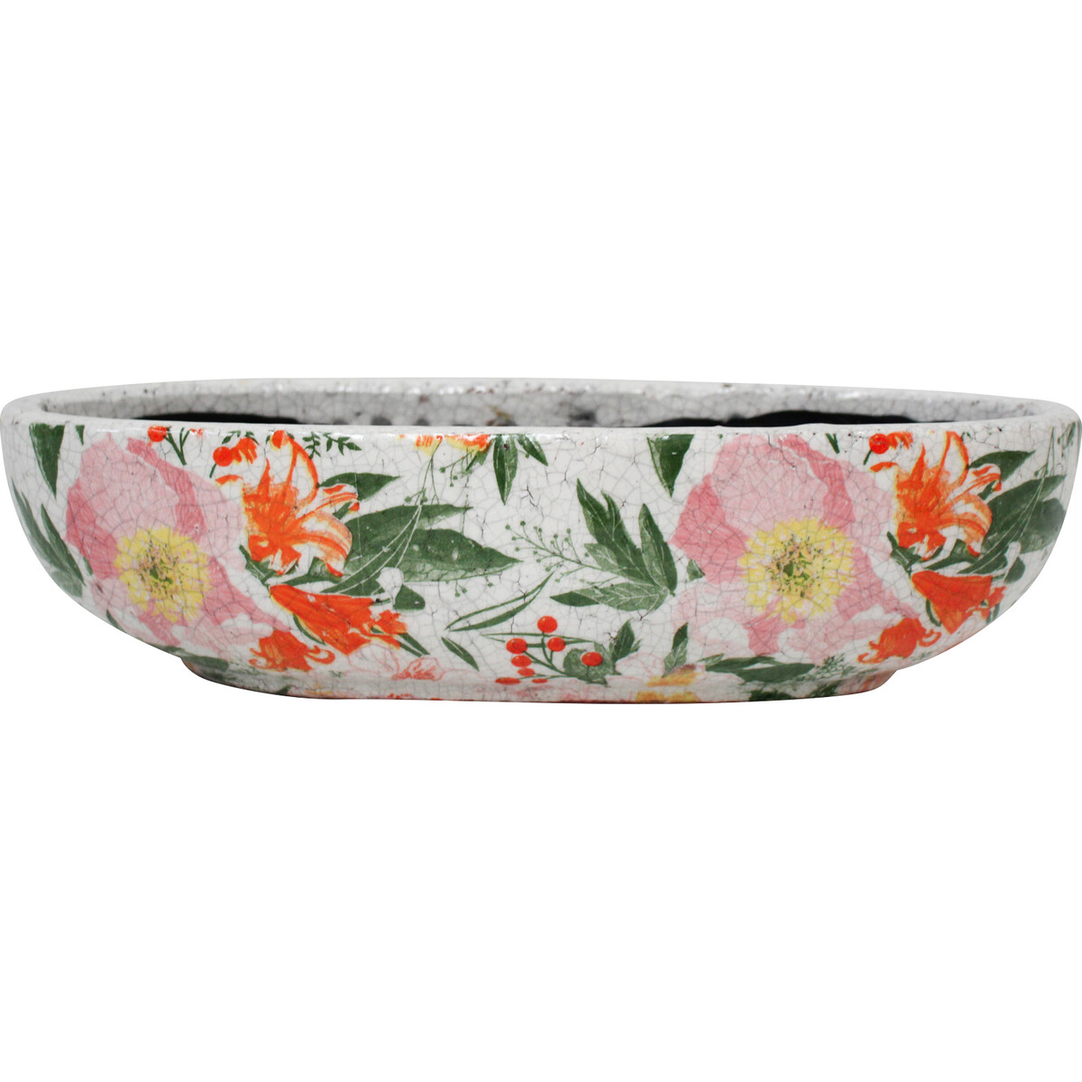 The love for flowers has more or less become an innate passion that only a small percentage does not have. As a result, planters have become consistently selling items all year round as it affords people the opportunity to grow plants right at the convenience of their own home and gardens. This particular pot isn't just functional as a planting pot; it is also extravagantly decorative due to its chic garden motif portrayed in vivid colours. It is crafted using terracotta earthenware material in an elongated bowl shaped pattern measuring 37 centimetres in length, 15 centimetres wide and 10 centimetres tall. It would sit perfectly on whatever flat surface it is placed as it has a flat base.