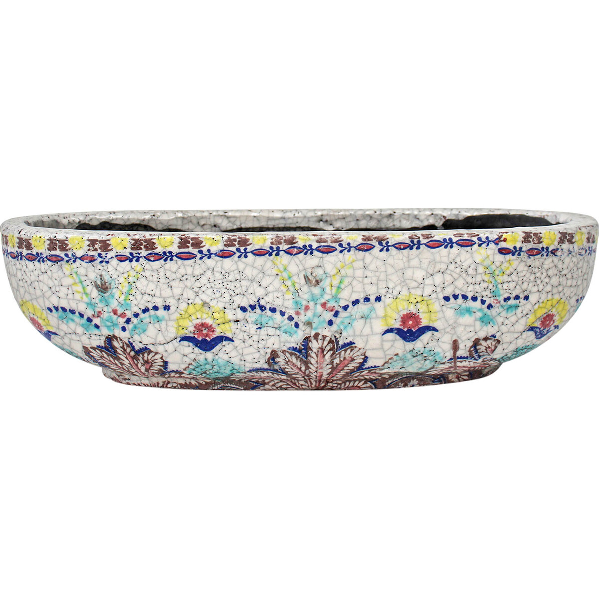 The Pot Oval Lrg Plume has two principally distinctive features that would immediately catch the attention of your customers and keep them curious about its immense decorative appeal and unusual appearance. It is made in a dimension which measures 36 centimetres in length and just 14.5 centimetres wide. It also has a height of 9.5 centimetres tall. This makes it more of a decorative terracotta ornament than a planting pot. On the surface of its exterior are colourful glazing of feathers and flowers in various bright colours of yellow, blue, etc.