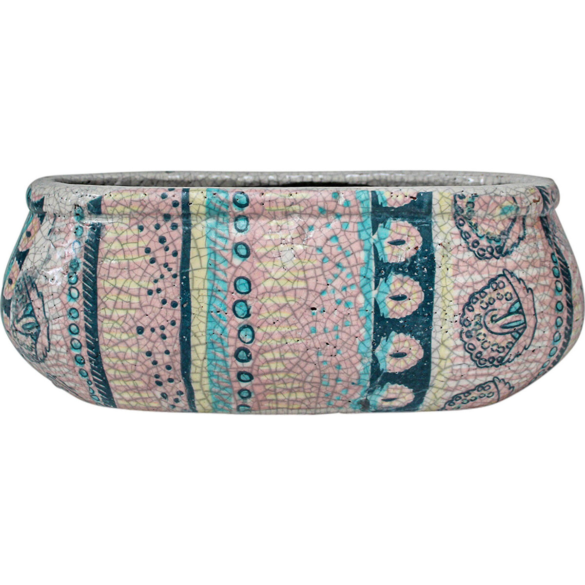 Adding the right kind of pottery vases and planters can give your love for natural greens and flowers in your spaces an easy to reside option. After all, with the right kind of pots and vases, your display gain whole new character. This handcrafted beauty from Lavida is a delicate pink and blue in colour with a delicately crackled surface making it all the more unique. The traditional Mexican pattern in it with the vivid blue in deep hue stands out as its most attractive feature. The oval shape with a height of 10 cm and a length of 26 cm and width of 11 cm, gives it a rather charming and elegant kind of appeal. A great choice of you have Bonsais that need to be displayed in flat kind of planters. A sturdy looking pot which has been handmade to adds a great deal of personality to its look.