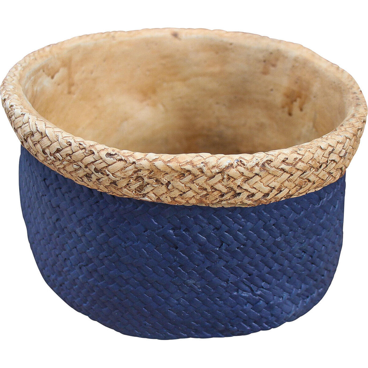 This pot is designed to weather naturally, the rich navy blue hue and finish is hand applied by trained artisans and will last a long time. A detailed wicker basket style carving lends a stunning texture to this pot planter made of cement that adds to its rugged flair and contrasts its woven pattern. It will look amazing decorating just about any table, shelf, or surface to bring out any transitional decor. This pot has a smaller size too and you can pair both planters together to complete the collection (sold separately) and they will look cute when grouped together!
