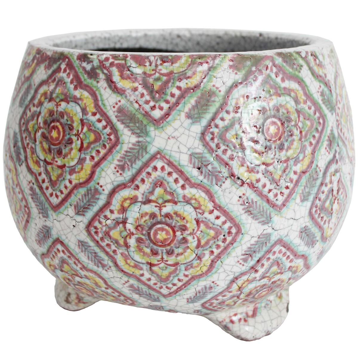 Made from fine quality ceramic, this round and curved body planter with a vintage looking pattern on white adds a touch of elegance and sophistication alongside the addition of the usual charm that fresh green always bring with them. The design and the finish of the planter makes it a sure bet for interiors especially in the living room where its refined good looks will help make the space acquire a truly elegant appeal. Well suited for leafy greens with broad leaves that look best in wide and rounded planters. Complement your green corner with this addition in which help you build a more finished and sophistication in your spaces .
