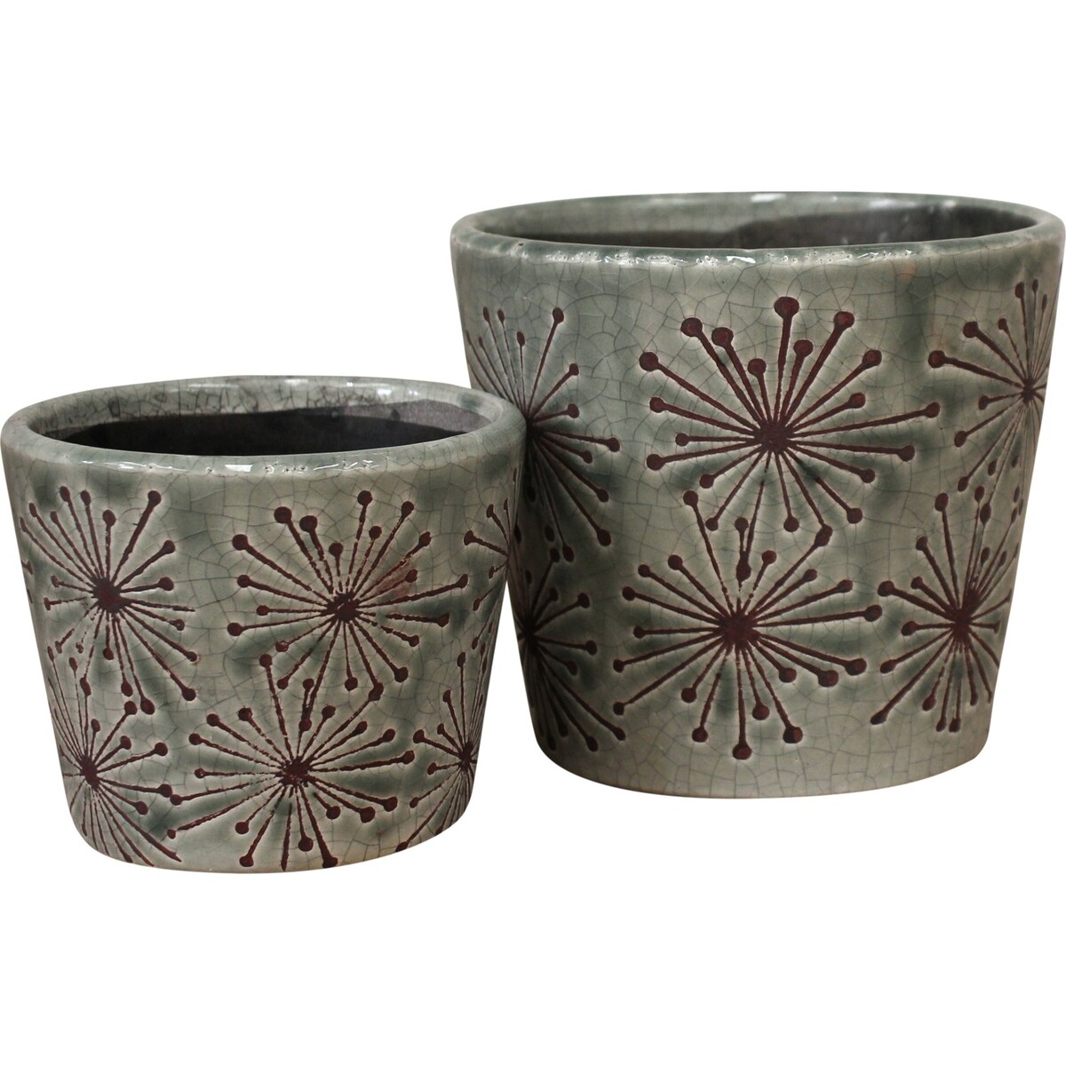 With this set of planter pots composed of two different sizes, the Pot S/2 Carving Ice offer customers the opportunity of growing different types of plants and engaging in different decorative ideas. Both planting pot are moulded using terracotta earthenware material and shaped in a lovely cylindrical design. The small sized pot is made in a dimension which measures 12 centimetres in width, 12 centimetres in length and 10 centimetres tall. It would be suitable for use in growing plants such as vegetables. The large sized pot on the other hand measures 15.5 centimetres in length and width.