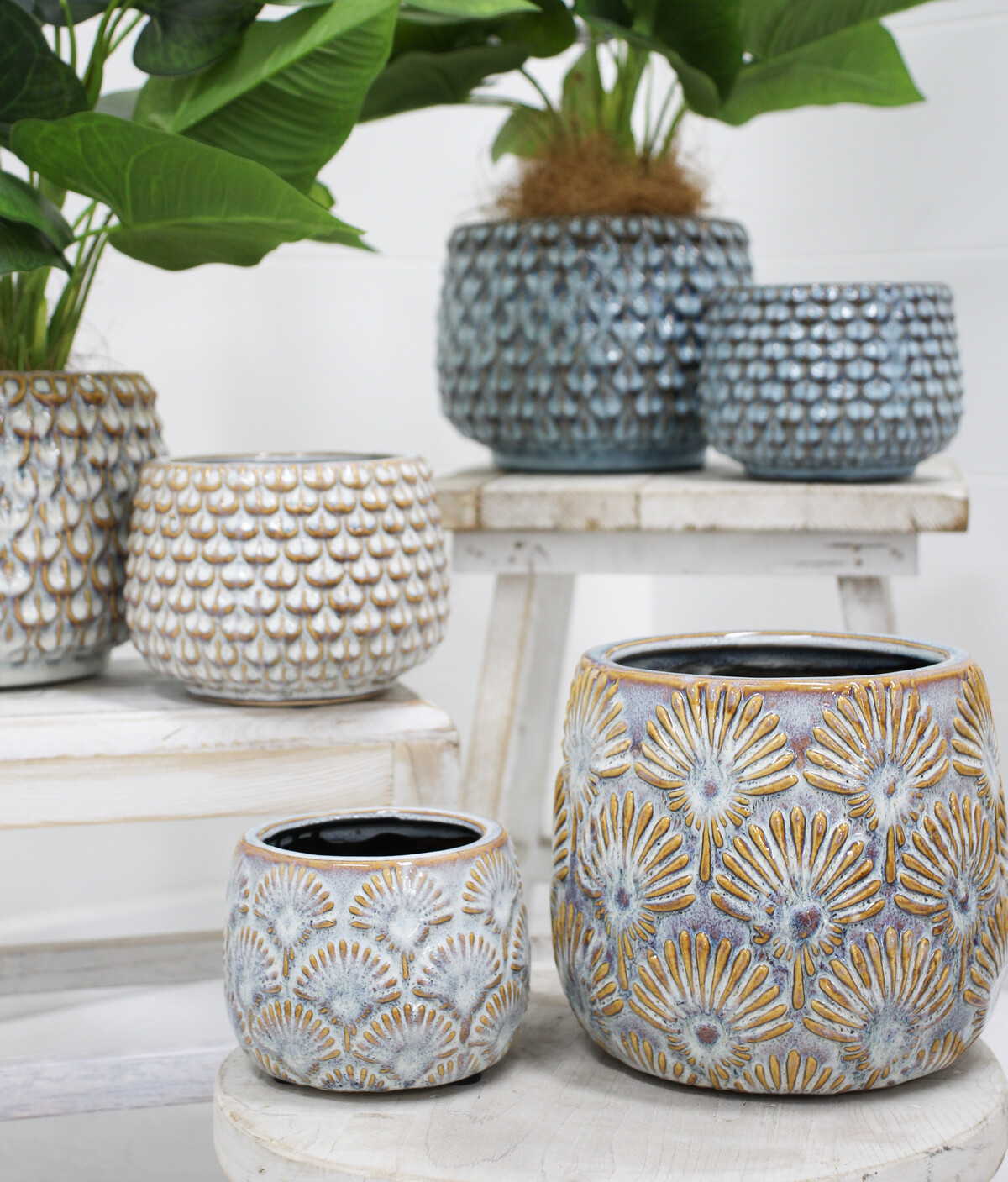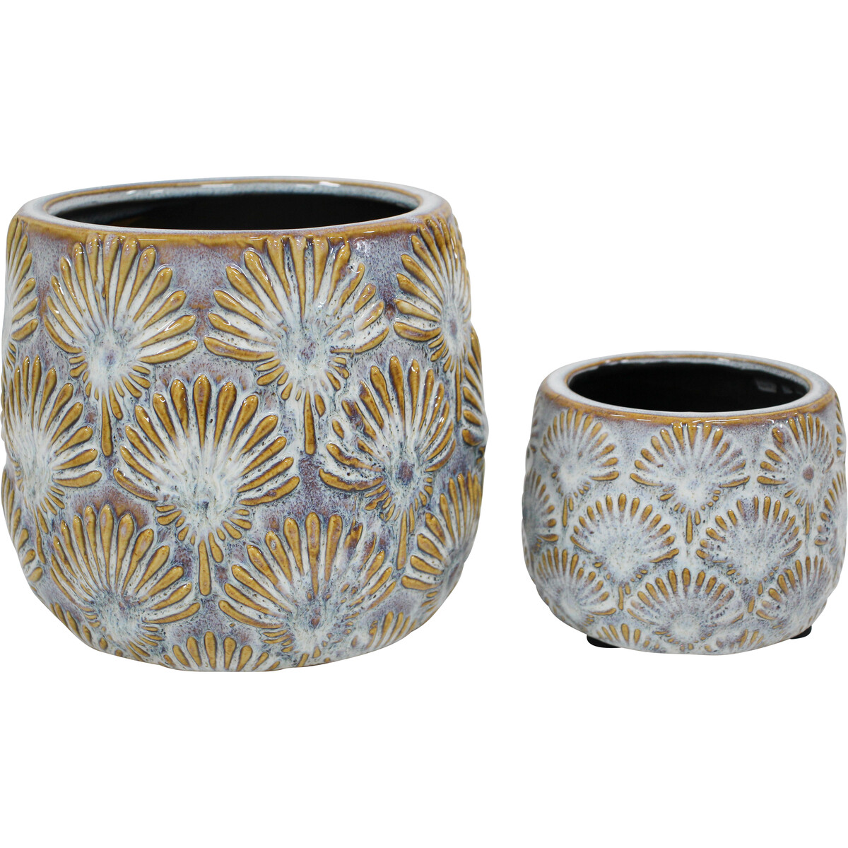The Pot S/2 Fans has a distinctively ornamented exterior which would attract and sustain the attention of all of your customers no matter where you choose to display this eclectic set of pots in your shop. While the interior of both pots feature a jet black painting, the exterior is textured in leaf shaped patterns before being beautifully lacquered. The large sized version in this set is made in a dimension which measures 17.5 centimetres in length, 17.5 centimetres in width and 15.5 centimetres in width. The smaller sized version on the other hand measures 12 centimetres in length and width.