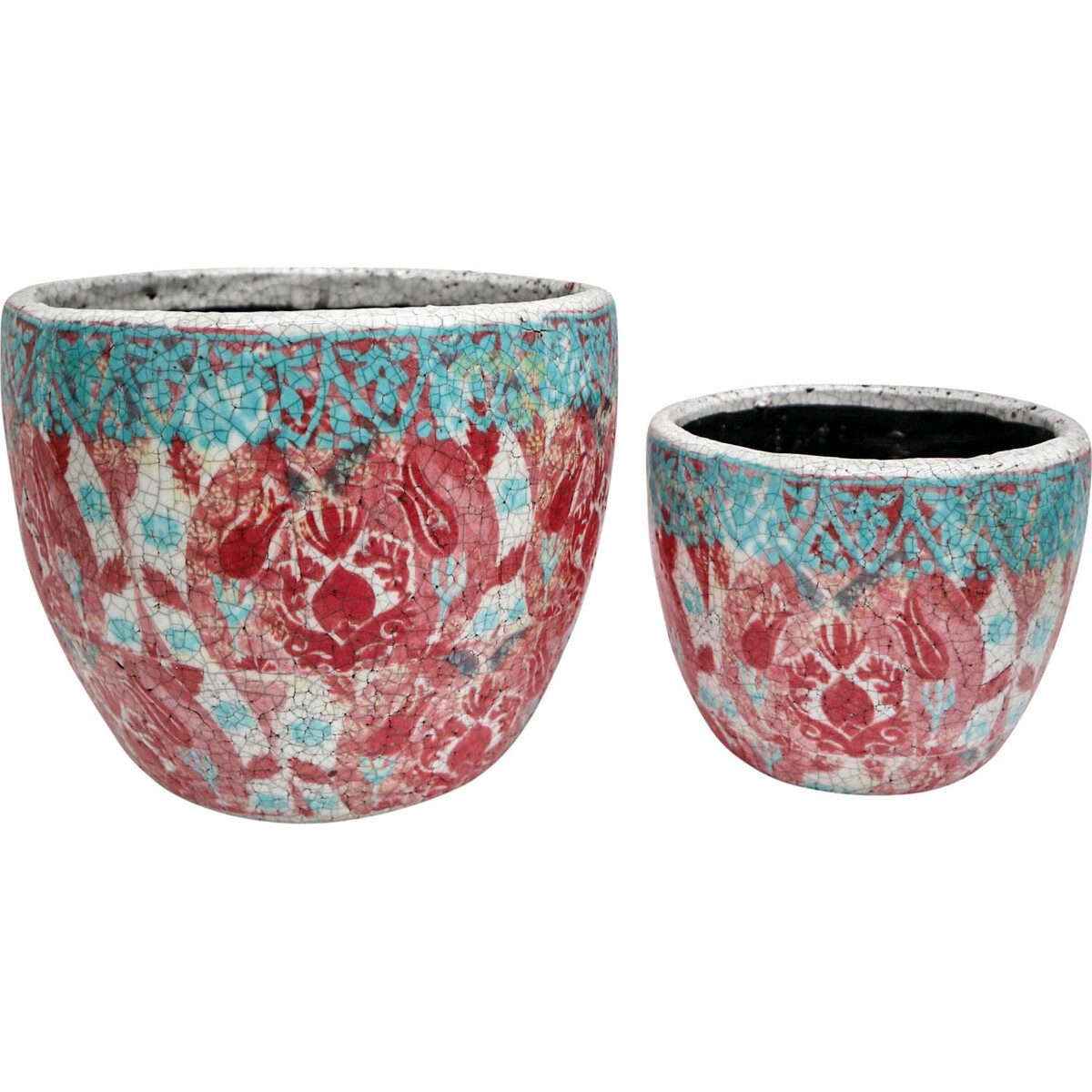 Since the Pot Curve S/2 Funky Blue contains two different sizes of the same pot with same design and shape, you can either chose to sell them as a set or sell each piece separately for the possibility of making higher profits. However, it would be best in selling it as a set. Each of these pots is artfully moulded using terracotta earthenware material before their exterior is then glazed in attractively colourful floral pattern. The pot is predominantly glazed in red colour while towards the pot's opening are blue coloured patterns.