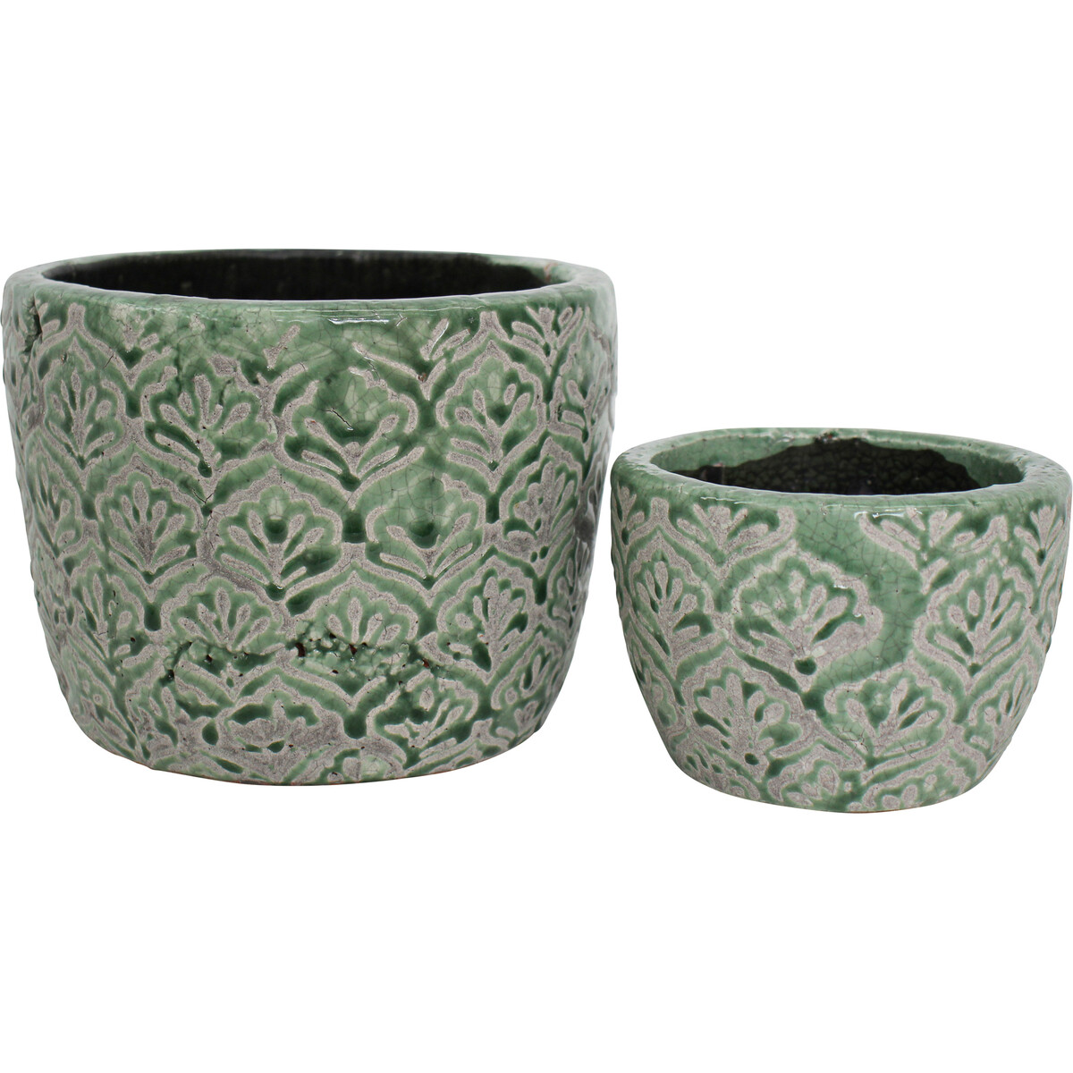 While both pots are made in the same vertically inclined cylindrical shaped form, and moulded through the use of high quality terracotta earthen ware material with their exterior being glazed in appealing floral patterns, they however, differ in size. There is the fairly large sized pot which measures 17.5 centimetres in length, 17.5 centimetres in width and 13.5 centimetres in height. This Pot S/2 Motif Jade also consists of a small sized planting pot which measures 13 centimetres in length, 13 centimetres in width and 9 centimetres in height.