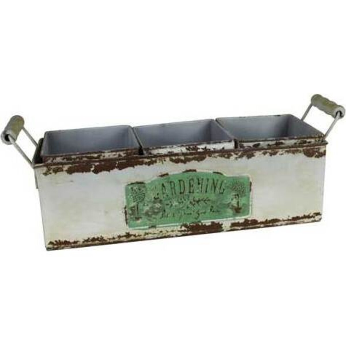 This pot set is meant to not just help arrange the plants in a better manner but also ensure that the garden looks fresh and character of its own. The three smaller planters are set within the larger tub that is about 33 cm in length and 14 cm in height and the smaller pots are square éeach of them about 10 cm in length and width. The tarnished rusty edges of the metal tub and the white peeling paint rubbed off in placed does not mean that the tub is any less strong or worn out - in fact it has the ability to hold three plants with ease. The tub looks all the more charming because of the green plate that has the letters éGardening' across it. The tub can be easily lifted with the help of handles that have wooden casing that allows easier grip.