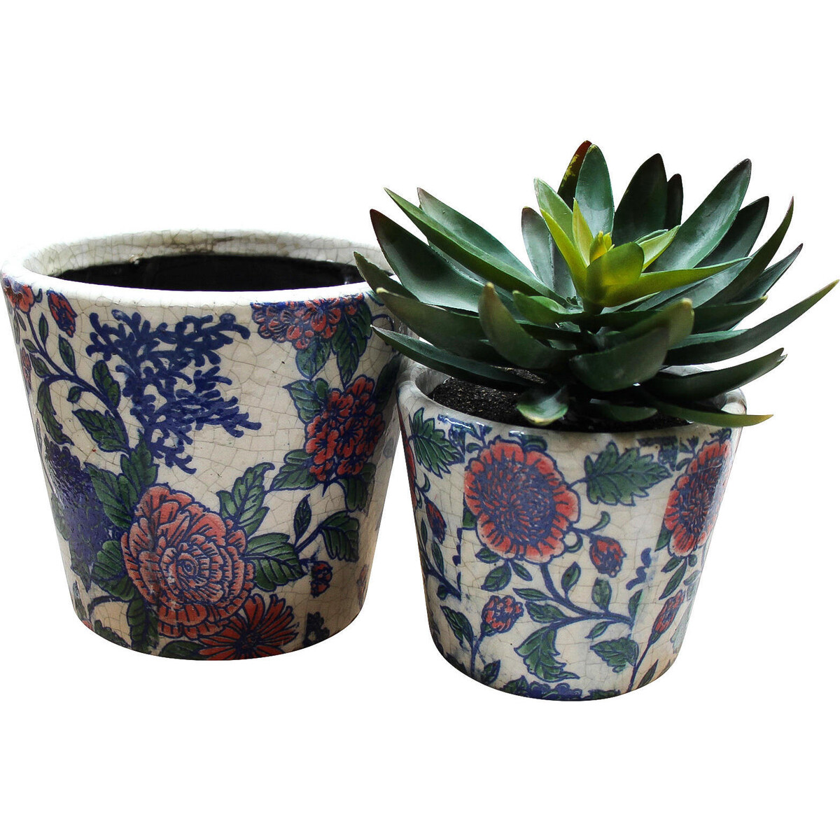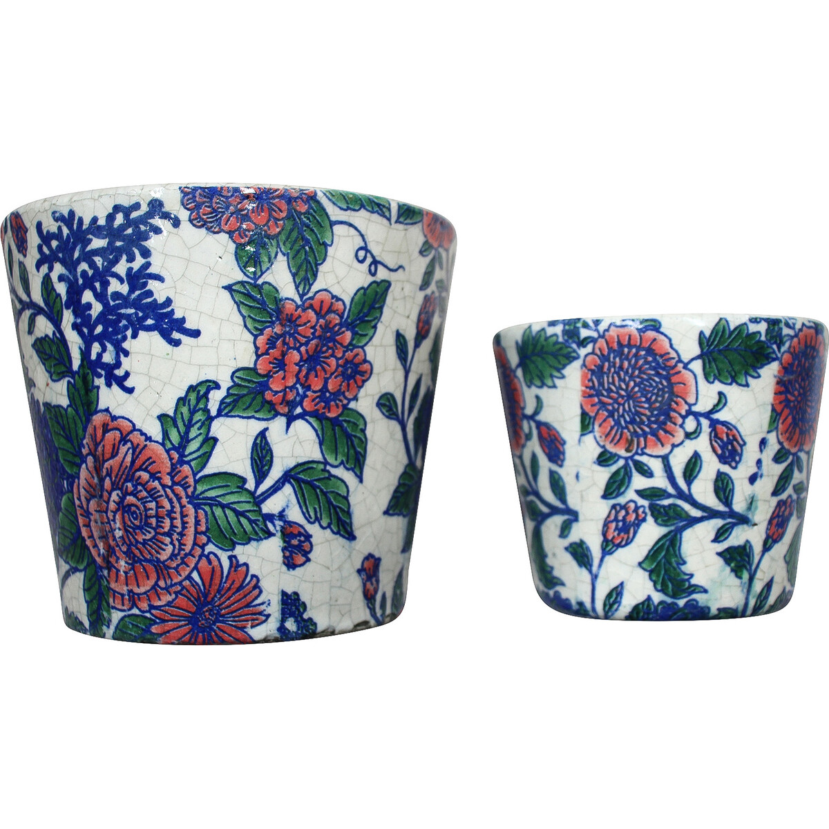 Perfect for use both indoors and outdoors, this terracotta made Pot Simple Flower S/2 is a set of two planter pots which are made from premium quality terracotta material. While the interior of the pots are a glossy jet black, the exterior showcases such a simplistic yet elegant depiction of flowers in variously appealing colours of blue, green, and orange which is glazed over an ash-white background.