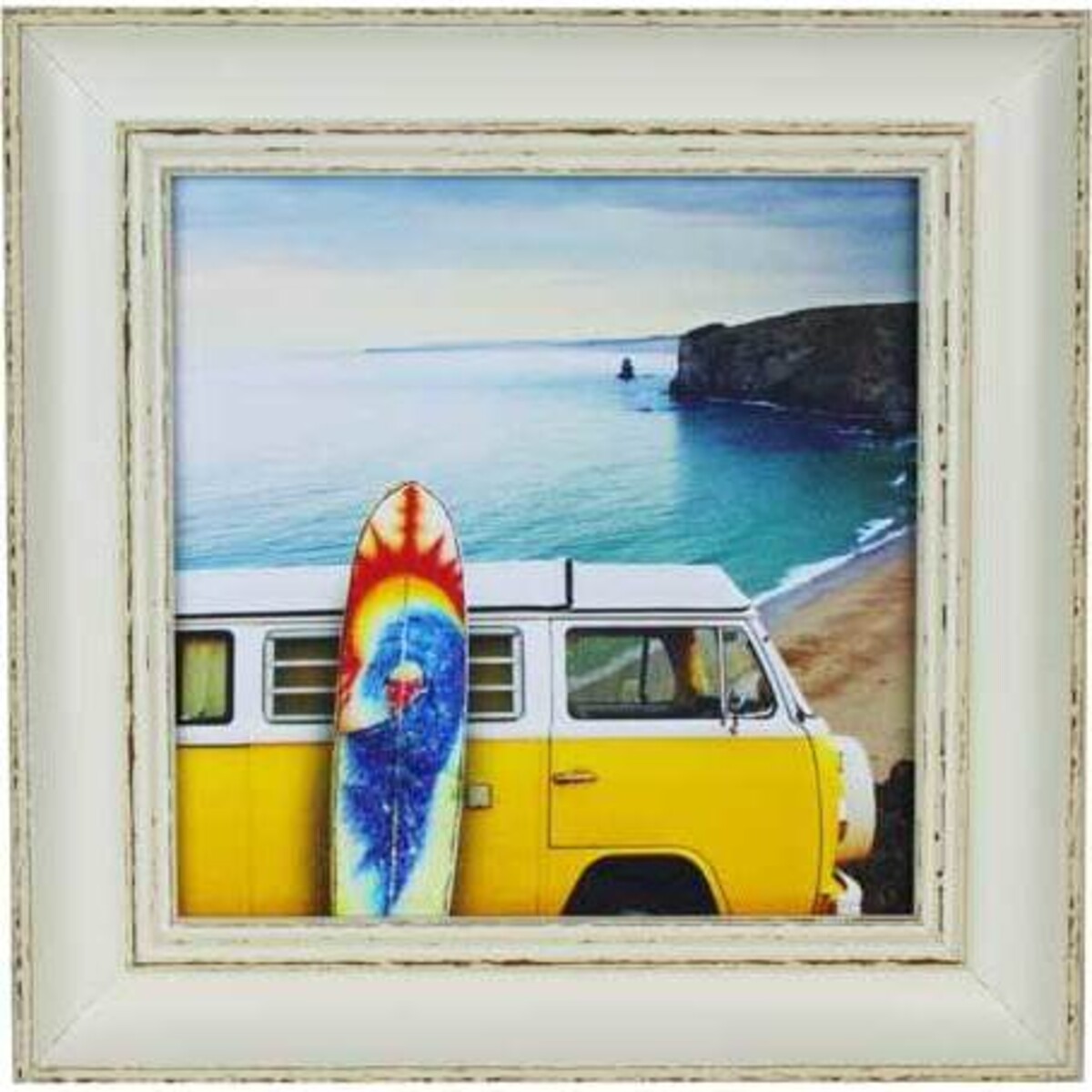Print Yellow Combi Near Beach is a special product that measures 27x27x2 cm and is crafted using MDF and wood for the exterior. It features a photo - shot of a combi vehicle, resplendent in yellow and white colours, having a flamboyant surf - board hanging at its centre, tip facing upwards. This image is set against the clear blue of an ocean, with overhanging cliff visible at a distance. One can acquire it for display purposes within the living room. It would appear enticing when hung alongside hallway, stairway or reception area. As well, this product can make for a thoughtful item to present at a special occasion, including weddings, anniversaries and like functions.