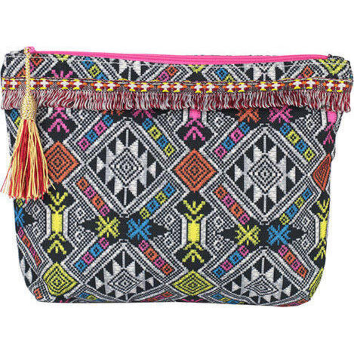 Purses are a great help for all girls - be it for keeping currency, keys, trinkets, or even one's makeup and what could be better than finding a purse that could in itself do all of that or simply be made part of a larger purse or hobo. This woven cotton polyester fabric purse is a classic piece of tribal design. Very Aztec in its looks, the colourful pattern is a riot of colours that gets all the more enhanced by the pompom tassel on one end in brilliant red and yellow dual tone. A fringed lace on the rim and the bright pink zipper closure lends it further dollops of colour and cheer. A perfect respite from things too formal. This gypsy feel purse could be your clutch bag on outings to the fair, the market or to a beach or a poolside party. Not too stiff, the pliable fabric makes room for so many things that even one such piece in your bigger bag could keep things so much better organized. About 19 cm in height and 24 cm in length gives it a size that is easy to clutch and carry in one's palm.