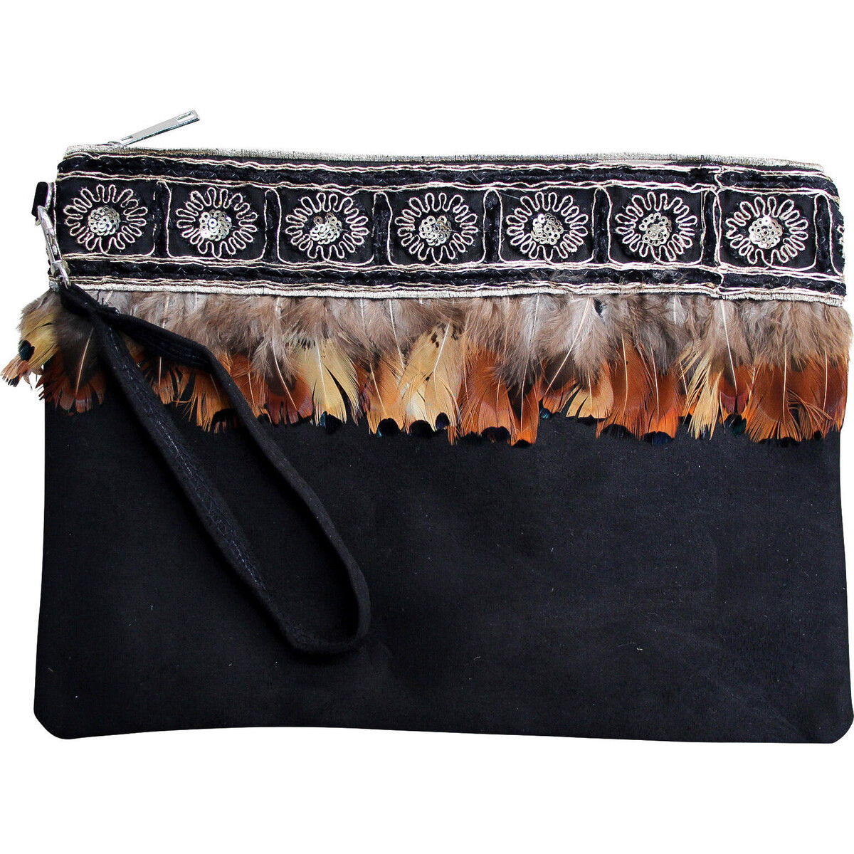 Designed keeping in mind the ease we need while accessing our everyday essentials-be it keys, coins, meds or the hurried touch up needed before getting off the car-all of these can be easily stored in this pouch bag with a zippered top. It has a delightful deep colour that shows off its lace trim and feathers. This classic look ethnic design purse has the kind of styling that will help give your everyday clothing a whole new pep. Loop handle makes it easy to hold and grip, while its trim made of feather gives it lovely Boho chic flair. Sized to hold a great deal-be it meds, trinket, currency, house keys or any such possession you need to quickly and deftly reach for. 30 cm in length and 22 cm in height-it creates a great impression as much with its solid colour as with its gorgeous detailing like the embroidered pattern in white on the dark backdrop or the trim made with faux feathers.
