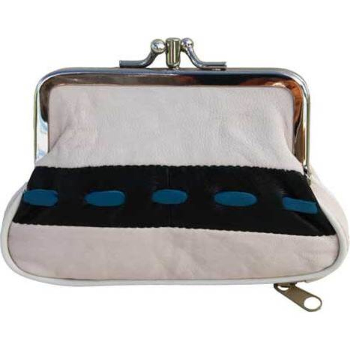 A well crafted white leather clutch with a gorgeously designed black band that heightens it retro feel.