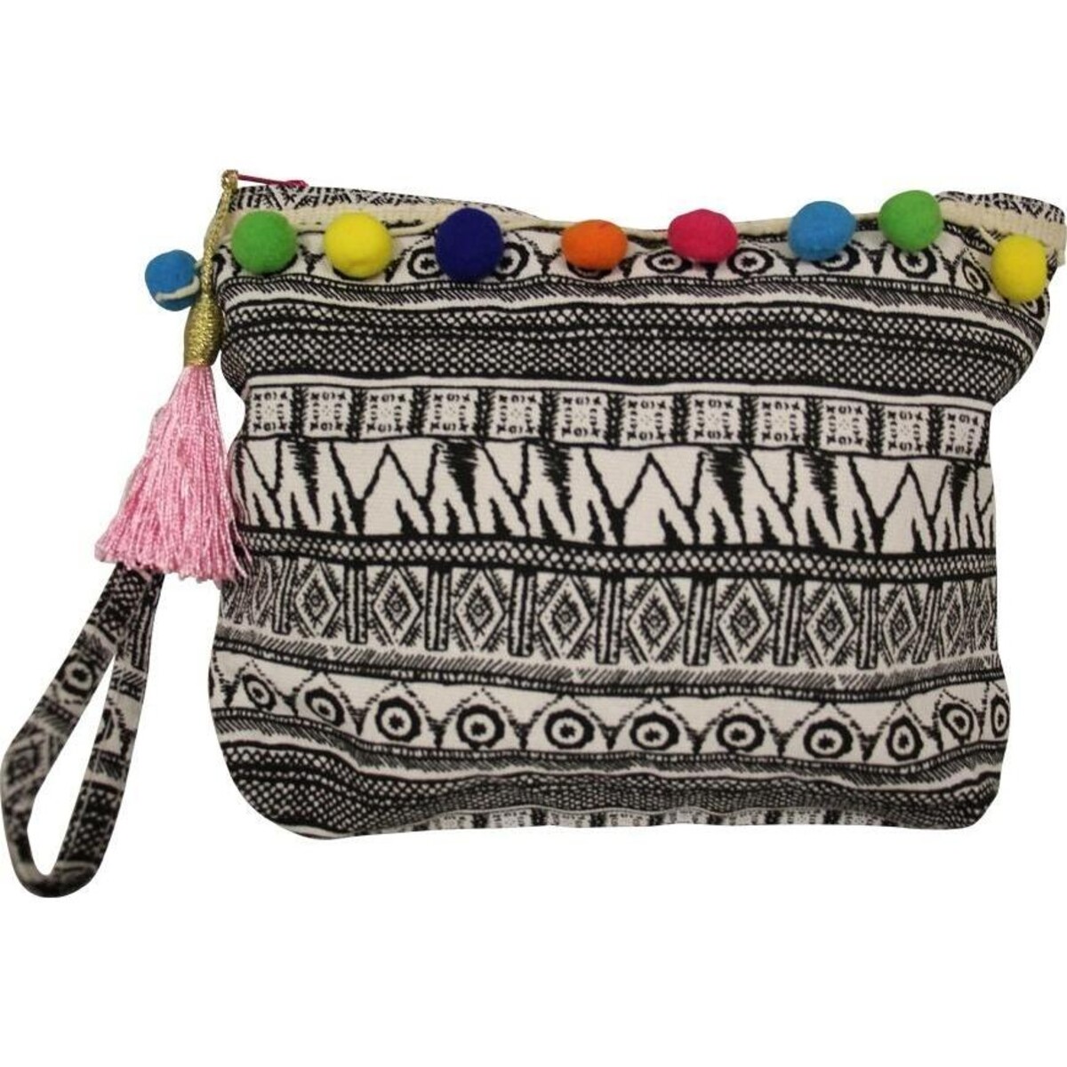 Add a touch of style that is leaning towards Bohemian chic with this one of a kind wristlet whose large size, spacious inner space and truly special combination of colours, makes it such a great find, if you are bored of the usual black and grey purses that play a sort of neutral role in supporting your attire - it is about time that you place the focus back on the accessory that will make its very own impact team it with jeans, dresses in neutral colours or simply take it out for your shopping trip - its black and white pattern, the touch of gold on the strap and the multiple pom poms in various colours adds a touch of happy abandonment. The polyester fabric is tough and sturdy and despite a lot of things which you will inevitably carry in it, it shall hold on fine. The loop like handle will allow you to grip it well. The zipper fastener makes it easy for you to open it with ease. Alight and casual accessory for your everyday outings.