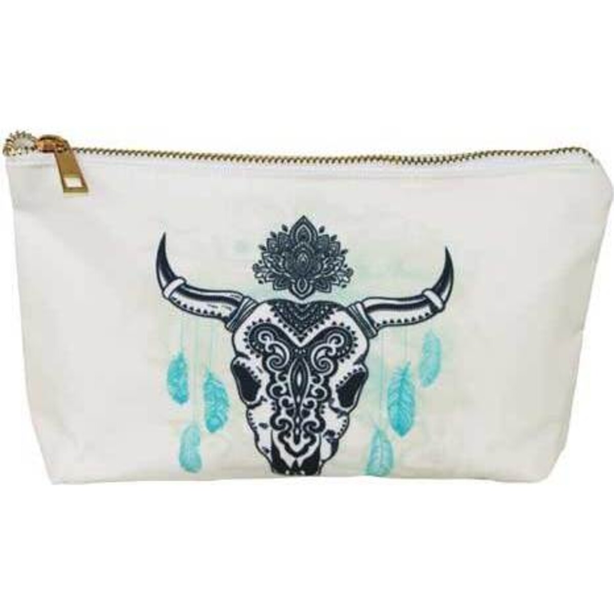 A beautifully designed purse cum pouch that has a creamy white texture and fabricated from poly canvas, makes it an accessory that can make a huge difference to the way you keep all your tiny little belongings in larger purse or when you simply want to carry this is a palm held purse. The zippered closure is high quality and will be resilient against continuous usage. The white backdrop is simply gorgeous on which the Cow Skull graphic looks rivetingly different. The soft blue colours and the tribal patterns make it a pretty palm candy to carry around juts as it is. The pouch comes in a size that will be hugely helpful in keeping your larger bag better organized while keeping safe your keys and trinkets. Reach for that lipstick or the compact super fact and add a spritz of cologne - whatever that is tiny can be carried in it with ease.
