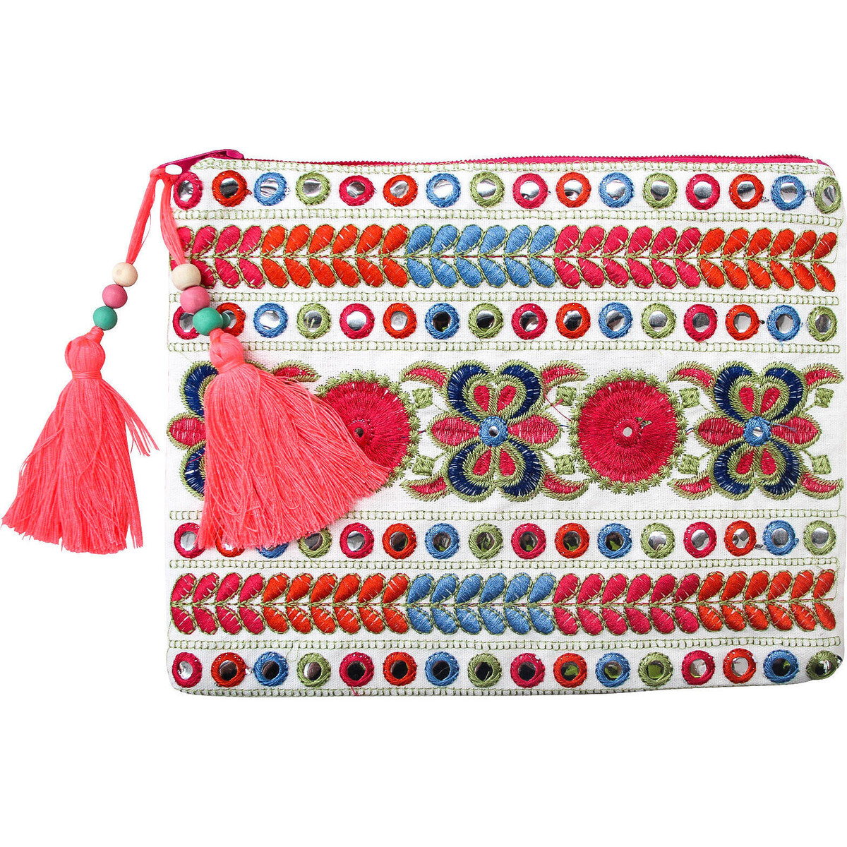 Made to hold your accessories and also make an eye-catching impression that comes from its superior finish and perfect size that can be held with ease, ités the kind of pouch that will be an asset when it comes to organizing things inside larger bags. Made from very fine and sturdy quality material that has been embroidered with thread work and tiny sparkles, the multicoloured pouch will be a lovely accessory with any plain dress. The zippered pouch is all of 20 cm in length and 25 cm in height with pink tassels adding more zest to the look. The width is adequately wide to allow keeping of keys and trinkets, currency and an odd piece of makeup. Grip it and hold it like you could any other clutch purse or let it sit gracefully in your large hobo holding on to your tiny assembly of articles that any girl always likes to carry. Smooth easy flow zipper makes it simple for your spaces your belongings in one smooth action.