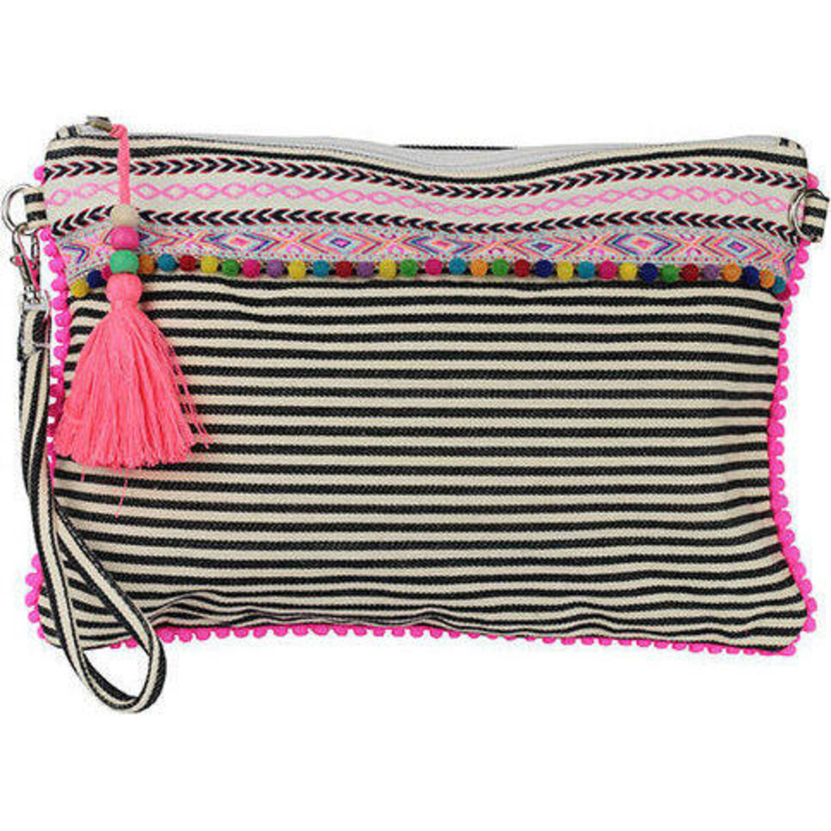 Made of woven cotton fabric, the thin striped making up the entire structure of the body, while the shocking pink trim makes the definition of its design all the more prominent. Something fun and funky about its rather Bohemian looks that attracts attention for all the right reasons. The stripes add formality broken immediately by the deep pink trim and furthered by the vividly patterned lace trim that makes up the upper portion of the purse. About 20 cm in height, the purse can be closed with a zip fastener that has been coordinated with the rest of its colours. The length being 30 mc makes it quite a large purse which could be made part of a hobo or a day bag. The purse has the capacity to carry all your essentials that any girl would be reaching out for - including your makeup, keys and currency. Make it part of a larger purse to help it be more organized. The soft feel cotton fabric has a natural feel and will see you through much usage. It has a tassel that further defines its fun looks. A loop at the end also would allow it to be used like a wristlet.