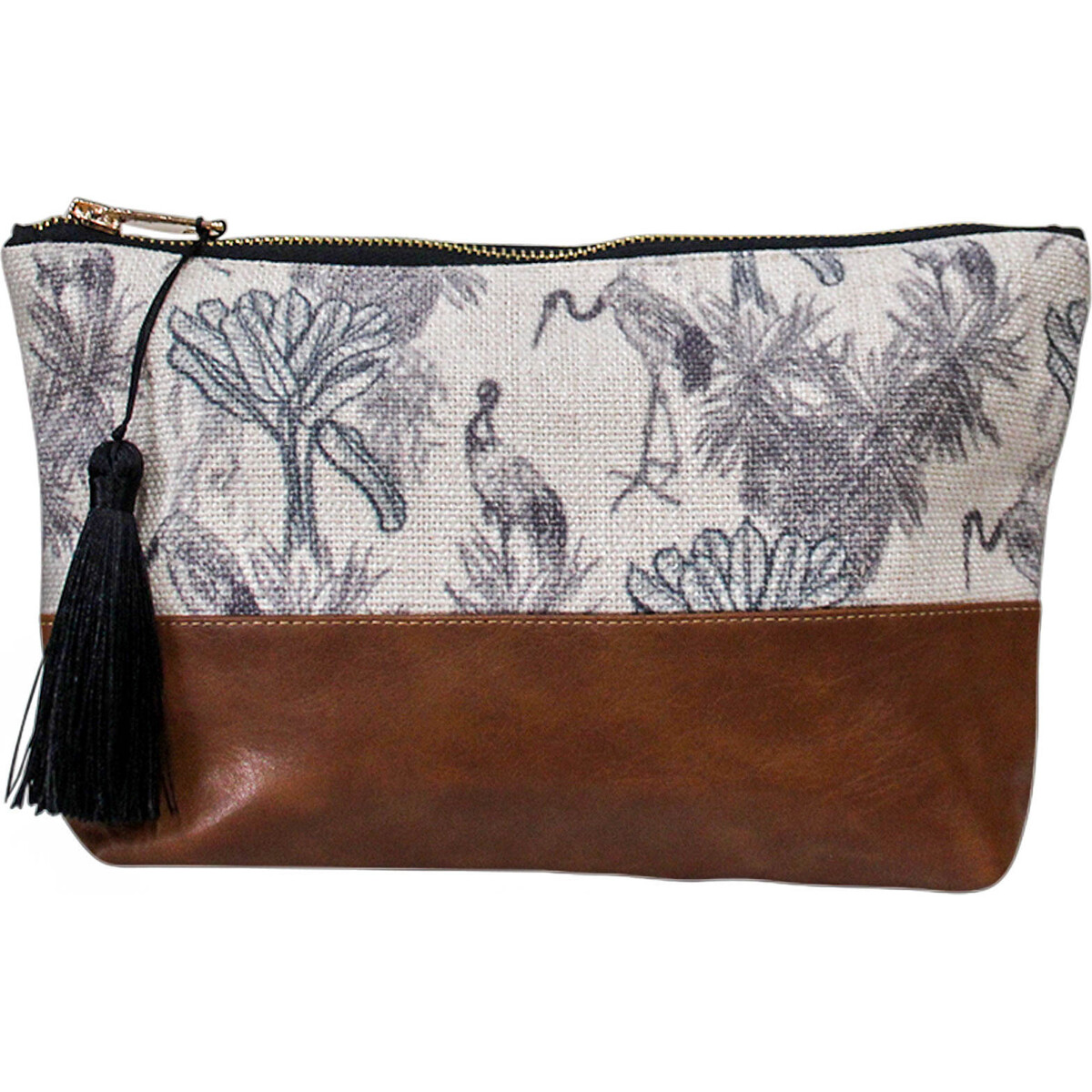 The Purse Stork is one which demonstrates unparalleled craftsmanship due to its uncompromising quality of materials, assortment of colours and intricate, well detailed depiction of a natural environment. The uncompromising quality is a result of the combination of tough polyester material with the durable synthetic leather - polyurethane. The assortment of colours features black painted scenery over a background of ash white with a base of leather brown colour. Finishing the image is the detailed, intricately drawn scenery which showcases a forest habitat with two stork birds and several plants. The zippered design with the dangling wools goes further to make it even more attractive.
