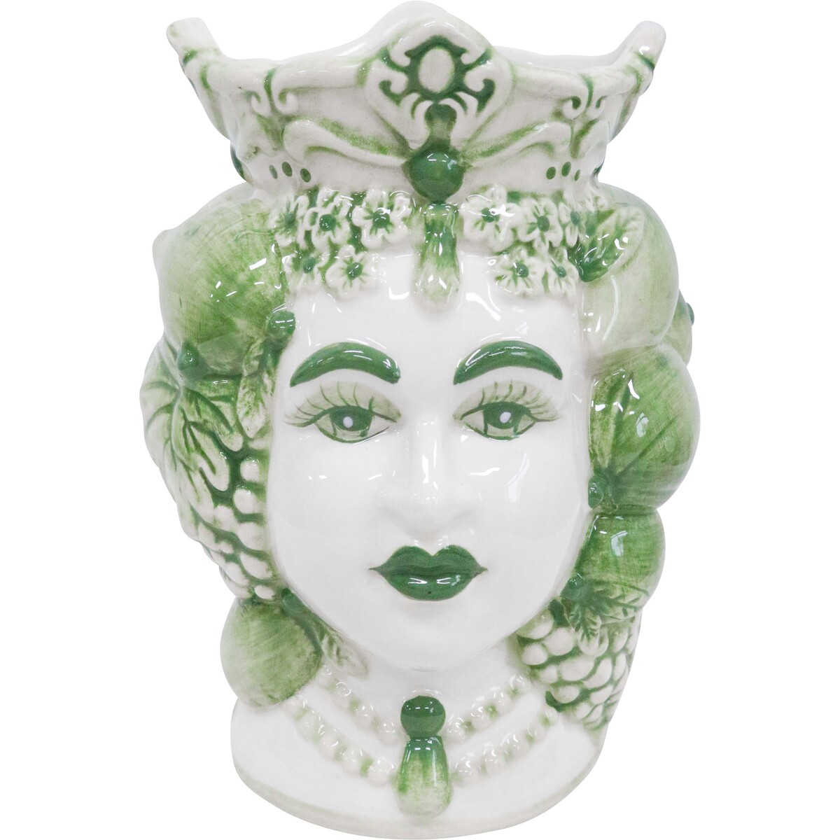 Introducing the exquisite Queen of Lemons Green Vase, a stunning addition to any homewares or giftware collection. This hand-glazed ceramic piece stands at 11.8x13.8x18cm, making it the perfect statement piece for both contemporary and traditional interiors. The intricate design features a charming face adorned with leafy accents and delicate floral details, effortlessly bringing a touch of whimsy and elegance to any setting.