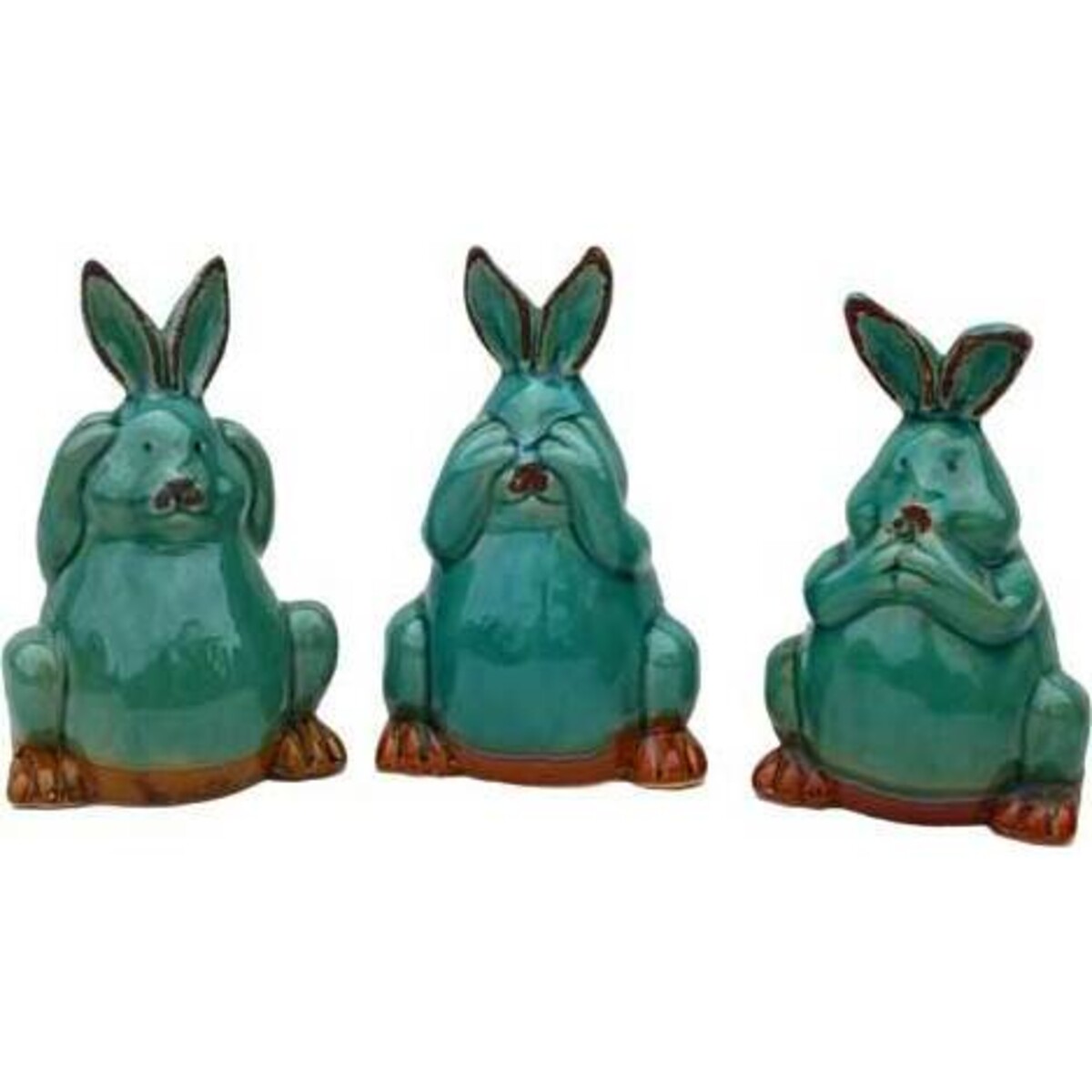 • Each member of this darling trio strikes a different pose to get his message across. Their paunchy tummies are evident as they sit on their haunches with hands in front of their ears, eyes, and mouth. • Each unit is a set of three rabbits. • Ceramic figurines are beautifully finished with a lustrous glaze that has the appearance of aged verdigris, dark leaf green and russet brown. They make the perfect little gift item, whether they're sold and used as a set or broken up by the customer to give to three errant children, each with the qualifying virtue. Be sure to add them to your gift department. Use them in lifestyle settings on a bookcase, desk, or child's room, or place them among plants or with other ceramic, verdigris metal, or animal themed items.